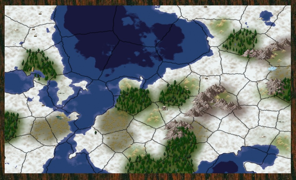 The first consideration was to have an appropriate number of water provinces for our single aquatic faction, Oceania (played by Vexing Vision). Aquatic nations in Dom3 play quite differently from their land-based counterparts. Land nations tend to find water provinces unassailable until they research particular spells or build magic items, and those are often costly and fairly deep into the game’s research schools. Alternately, a land nation may discover that a territory they conquer hosts amphibious troops, capable of moving both on land and in water, but this isn’t a common find. So it’s rare that an aquatic nation will find itself under siege until at least a couple dozen turns into the game. The flipside is that aquatic nations’ troops tend to be ill-suited to combat on land, meaning that a good aquatic player will have to exert some effort to gain any significant beachhead. This map gives Oceania a solid — but not too powerful — start position in the northern sea, where he will have immediate access to six provinces and then will have numerous options about which theater to expand into.