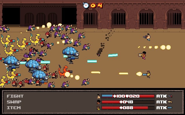 When I was a kid, my dad finally buckled and got me Doom for the SEGA Genesis 32X. My mother was horrified. I insisted that there was an art to it, a series of techniques that resided in movement and weapon selection. She remains to this day unconvinced. It’s systems like the one that Vlambeer has cobbled together here that leave me a swelling sense of vindication. Once you’ve selected your weapons and firing-lines, you have nothing to do for five seconds but watch while your heroes run backwards while firing madly at the approaching horde. Nothing to do, that is, but move your group up and down, trying desperately to spread out the damage they’re taking and keep their shooting lined up with enemies. Five seconds of pure ballet, dodging mixed with maximum damage-dealing. And it interacts perfectly with the RPG-lite ordering system that interrupts the fight after those five seconds are done.