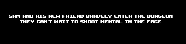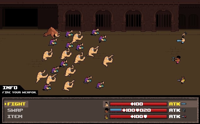The battle mode is a delightfully haphazard cross-pollination between those childhood RPGs and the Serious Sam run-backwards-while-shooting technique. You will be permitted to plan a move for each manly man, such as firing a gun or using an item (medkits, armor, revive, etc). The guns themselves perform different useful actions: magnums fire upon whatever abomination is closest to our heroes, while miniguns drive a concentrated barrage of freight-train bullets in a straight line of your choosing, and a laser rifle slows an enemy’s mad rush. The various weapons are pleasingly distinct, providing a surprising amount of depth. Once you’ve assigned each hero an action, the round begins.