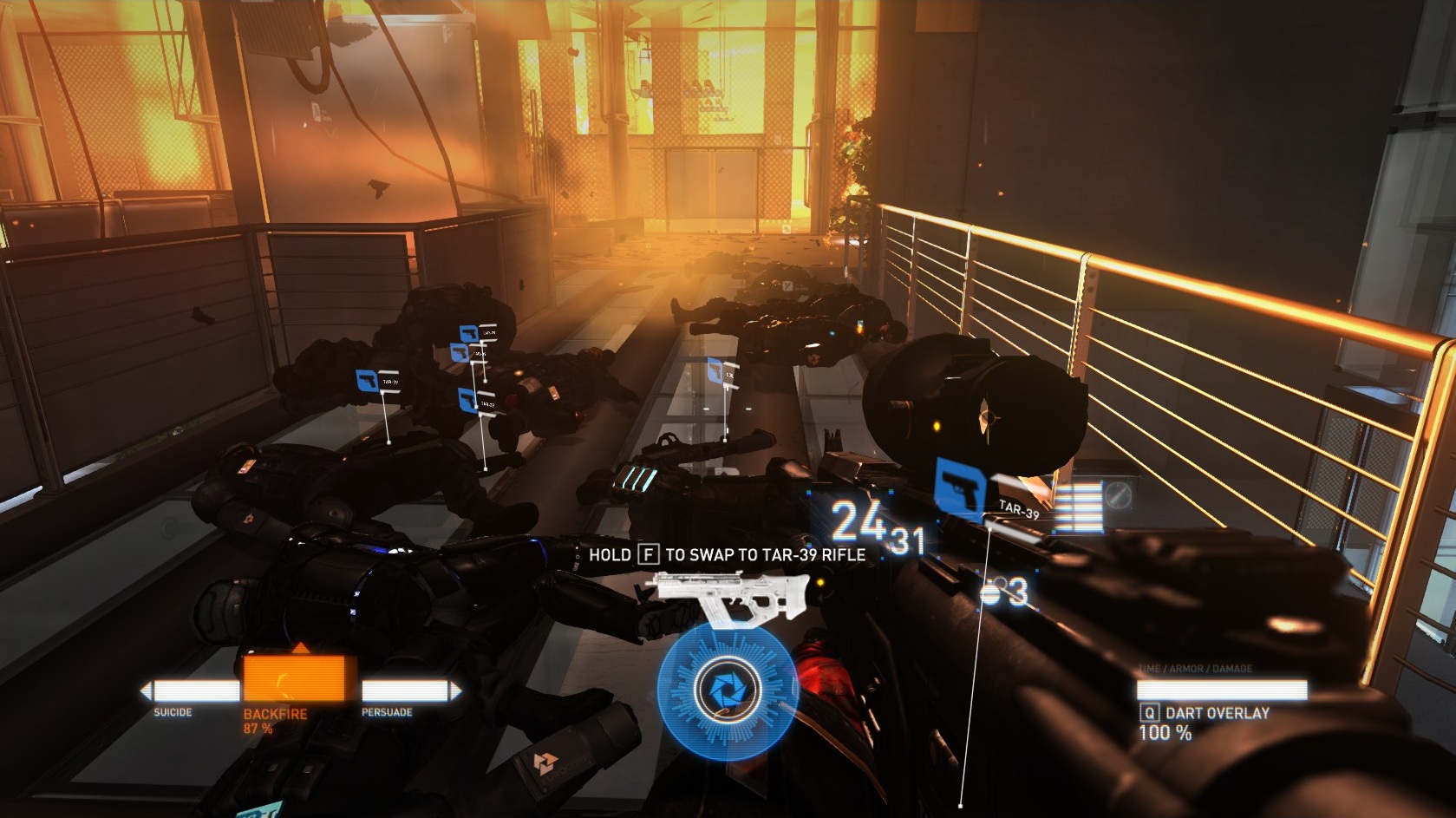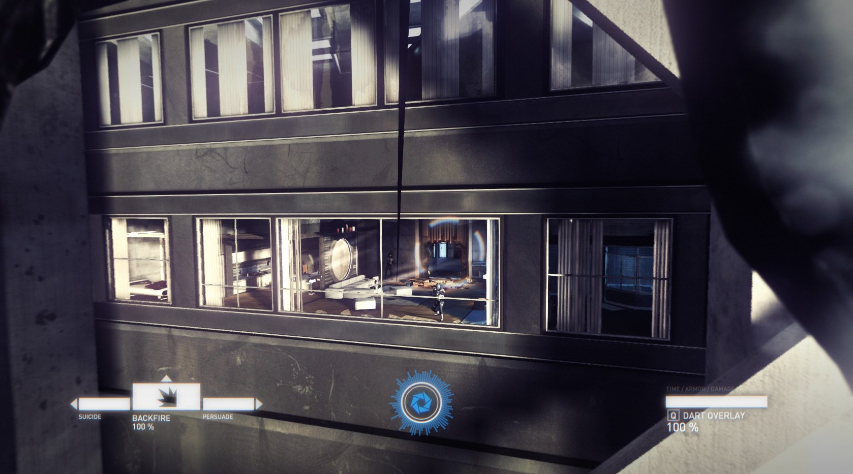 You play as an agent of Eurocorp. Your name is Miles Kilo, a name that’s so awful that I hesitate to put it in this review, and it makes me contemplate worming my way onto the editing team at Starbreeze. Anyway, the game begins on Miles’ first day as a real agent. Walls of text in the pause menu inform you that the armies that defend the corporations are blunt instruments, so agents are trained/developed for such niceties as infiltration, sabotage, and covert ops. Throughout the game you’ll take place in some of these covert ops: