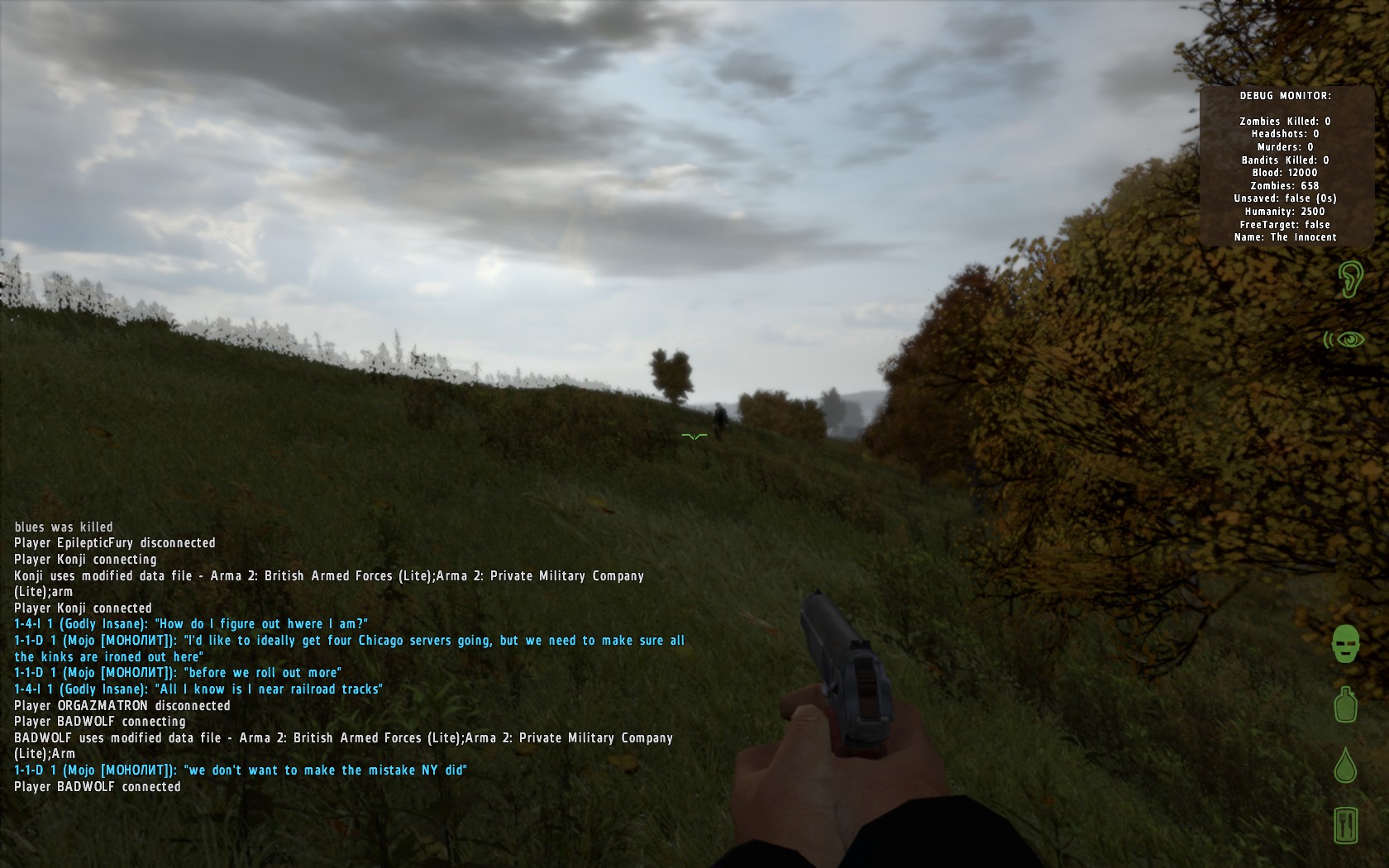 I was still trying to clear my head when someone came rushing up the hill. I figured it was another of those zombies, having spotted me from a distance while I sat around like a dummy. I realized in time that whoever it was, he was too quiet. Bob never realized how lucky he was that although I had the shakes and blurred vision, my head was still intact. He was another wretch like me, cast adrift in Chernarus. He’d heard my gunshots, he explained, and came to investigate. We talked for a little bit, but our conversation was stilted and awkward. Eventually, he motioned that he was headed down to the little town that I’d avoided, and I was welcome to tag along so long as I didn’t hold him up. With nothing better to do, I went back down the hill the way I had come up it, and Bob and I went to town.