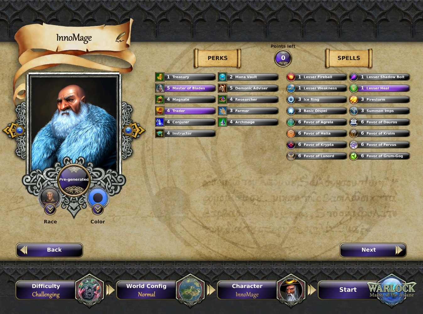 Warlock: Master of the Arcane is a member of the delightful sub-genre of jealous mages, wizards, demigods… fine, and warlocks, all of whom have the lofty aim of inheriting the world by exterminating anyone else with a chance at power. Which places it in good company with such games as the classic Master of Magic and the more-recent Conquest of Elysium 3 (which I may have written about a few times). Of course, the downside to standing in such tall company is that you run the risk of looking pathetically husky, so it’s with relief that I can say that Warlock passes the first test of any turn-based game by being addicting. It’s possibly the best compliment that I can pay Warlock to tell you that to write this review I started a new game with the intent of taking a few screenshots of the character generation screen and the starting layout, and two hours later I’d forged an empire that spanned three micro-continents and was well on its way to total domination.