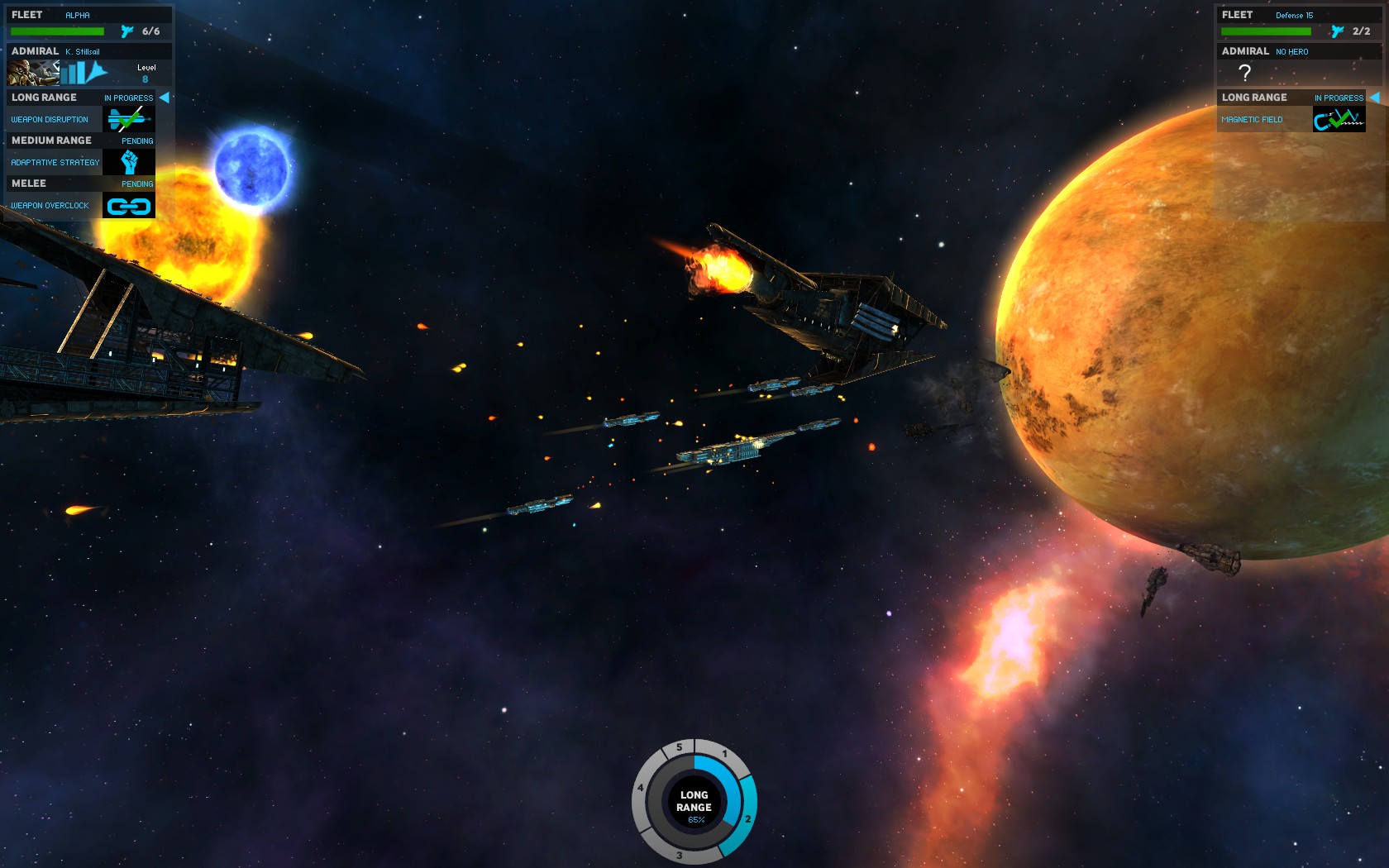 When battle begins, two fleets appear and they both choose three “cards” (representing the tactics they’ll use in combat), one for each of three phases. The first phase is at long range, where missiles are most effective, while the second is at medium range (bring beam weapons), and the third is up close (fire kinetics!). The cards you assign to each phase will give bonuses to weapons or defenses, or decrease the efficacy of enemy systems, and can trump certain other card types. So, for instance, a Camouflage card (which falls under the “defense” archetype) will help evade missiles and kinetic fire, and will trump any card of the “sabotage” archetype. This will be good if your enemy picked a sabotage card like Weapon Disruption, which shorts out enemy missiles and counters “offense” cards.