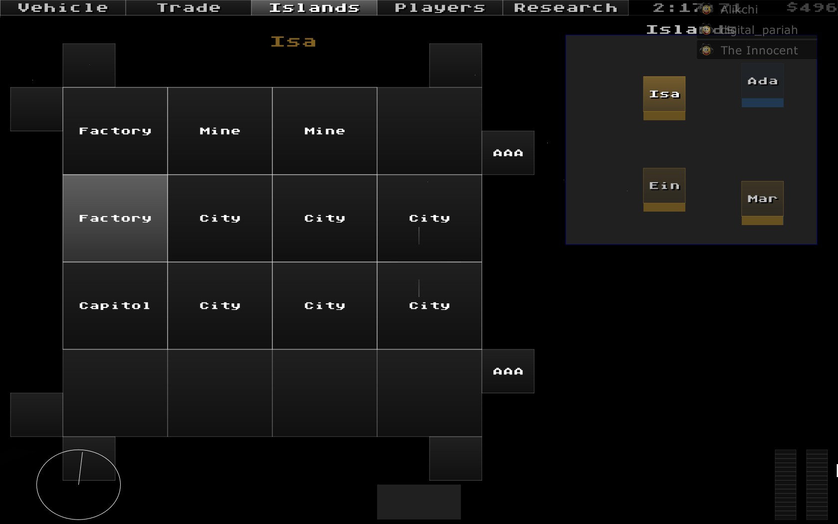 There are enough buildings to allow for specialized islands, but not so many to make the mechanics overwhelming. Above, Isa Island has become a moneymaker, thanks to two mine-factory sets. Mines harvest raw materials, which factories then convert into cash. The Capitol spreads your team’s influence, so it’s the building you’ll put down to take over an island, and the building you’ll tear down with heavy ordnance to wipe your enemy’s control away. Your shores and skies are protected by all-purpose AAA guns. Laboratories (not pictured, so you’ll have to use your imagination) generate research, which gradually unlocks better vehicles; so feeble fighters will eventually be replaced by bombers, and missile boats carrying four rockets can be superseded by ships bearing a rack of sixteen warheads. Oh, and those City blocks do nothing but block enemy fire onto the far side of your island—apparently your faction is completely heartless, as there’s no incentive whatsoever to protect them.
