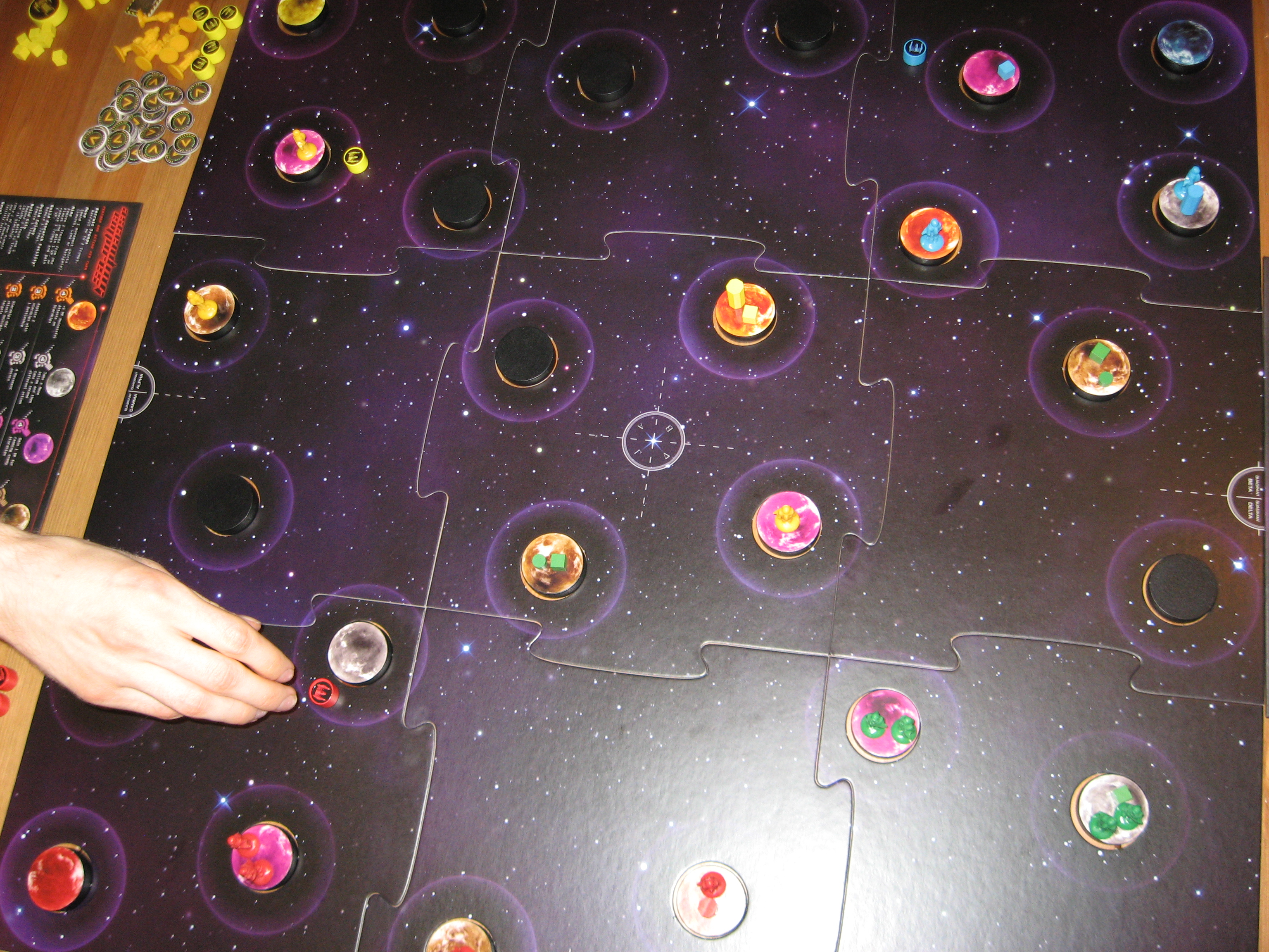 “Downsides?” you ask. There are none. Okay, strike that, there’s one, but only if you’re a grump. The board is fitful, and needs to be assembled, broken down, and stored carefully; and its jigsaw construction, which sees nine segments interlocked, can lead to ships skipping when they hit the point where the boards meet, or sliding weird when they hit a curve. My solution is so elegant that I’m shocked the designer didn’t stumble on it (the manual is laughably generic. It explains the rationale behind why colored planets help with colored technologies, but not why you navigate by flicking ships). When I explain the rules, I always tell my group that the edges are folds in the space-time continuum or some other mumbo-jumbo (“That’s not how space works,” says the scientist friend. I let him explain it with bigger words and he’s placated), and so when ships skip off a fold, it’s part of the game. Suddenly, those rare instances when the board fails us are funny rather than frustrating—and really, this is not a game that’s meant to be taken seriously.