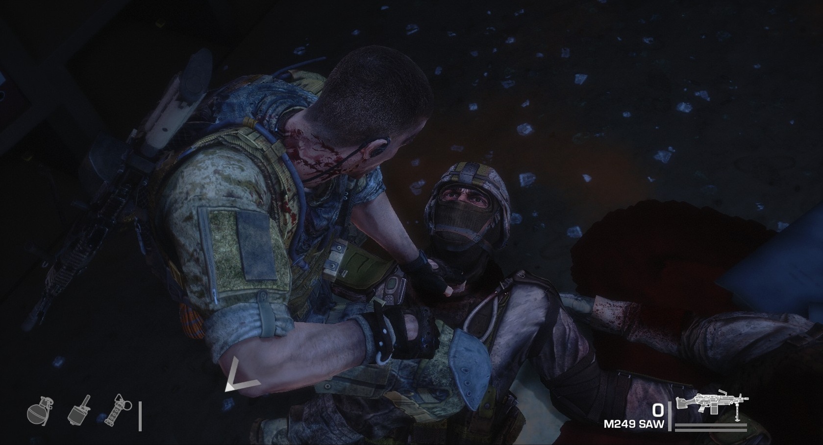Spec Ops draws attention to the horrors of war by showing your defeated enemies crawling around and crying for help. I hoped that this was potential for morality arising from game mechanics, even if it would be simplistic, and the lead developer’s statement that you could react in a “number of ways” strengthened this hope. But this is another unrealized claim. There’s no option to give water and morphine to the survivors, or interrogate them for information, or flick them a shiny coin—in fact, saying that you can respond to the wounded in a “number of ways” is like saying that Reese’s Pieces come in a variety of colors, and that’s a pretty limited comparison because there are more colors of Reese’s Pieces than “number of ways” on display: in actuality, you either perform a brutal execution, often depicting your character beating the man to death with his gun or bare hands (and get some bonus ammo that you apparently can’t lift off a corpse); or you ignore them.