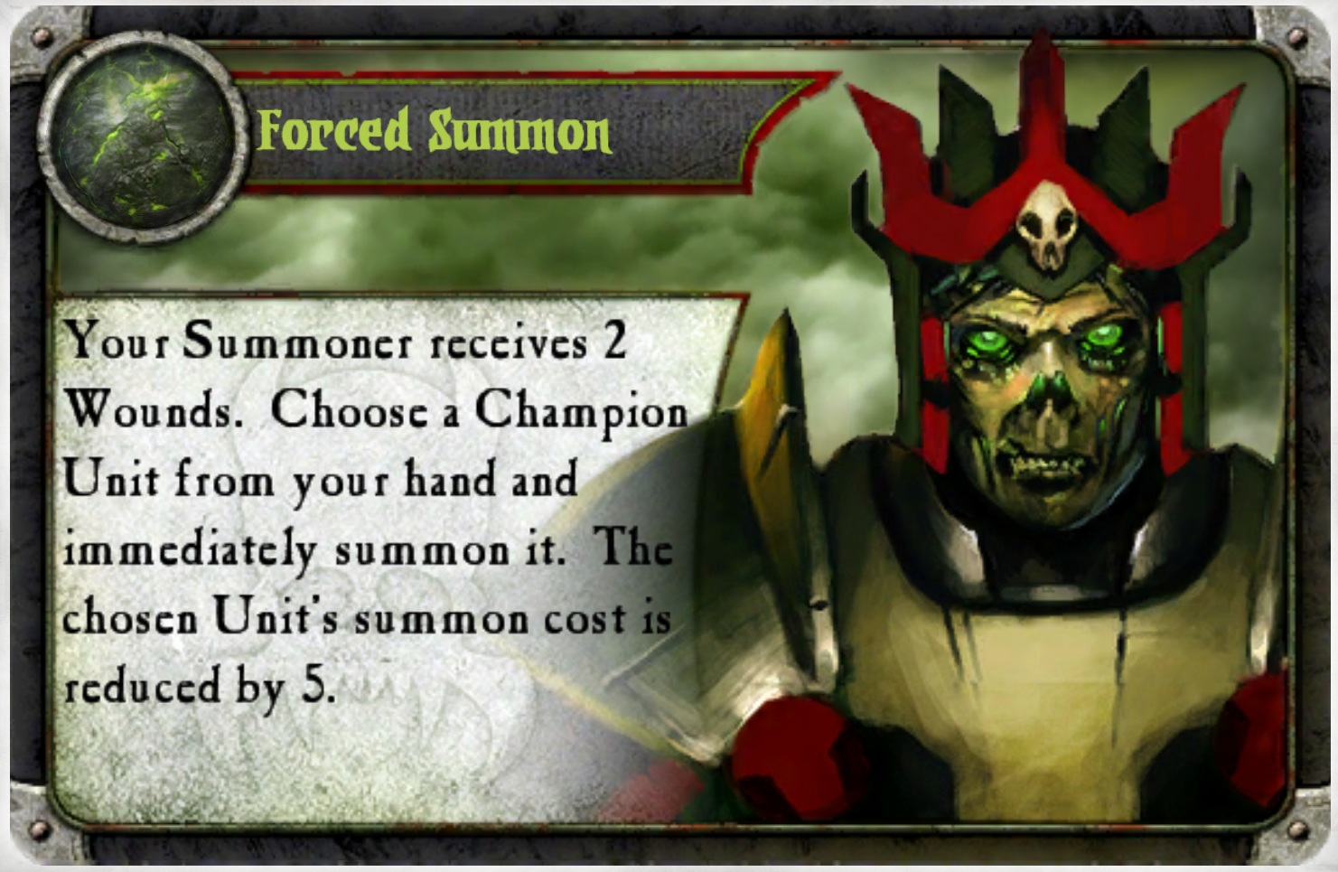 See, the event that I drew will decrease his summon cost from 7 to 2, and his own ability will allow me to discard one of my fielded units (a lowly Skeletal Archer down on the left back row, no loss) to decrease his summon cost to 0.