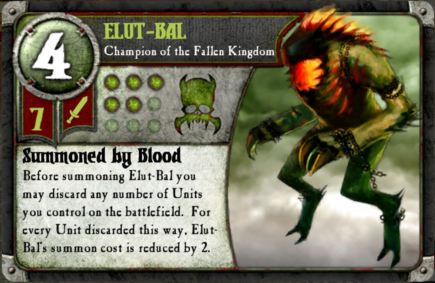 So he orders Elut-Bal forward, chasing frail Prince Elien around the back of the Phoenix Elves’ board. On his turn, not only is he wasting moves to scurry away from the rampaging Elut-Bal, he’s also forced to burn loads of cards from his hand into his magic pile in order to afford some extra troops in the following round.