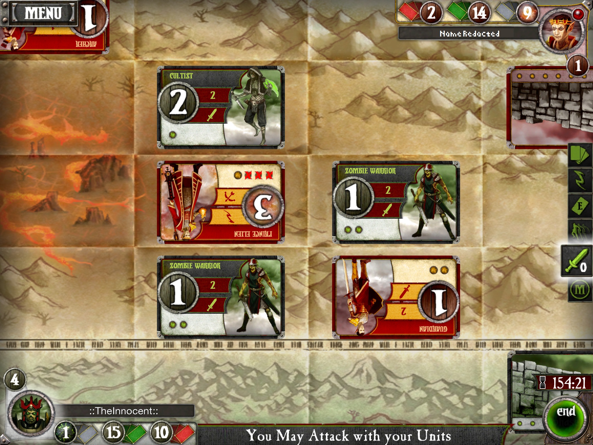 Take a look at the above picture. I’m playing as the Fallen Kingdom (green), and my opponent is the Phoenix Elves (red). We both have a handful of troops, a Wall—which, unless you place more Walls or have special abilities, is the only tile you can summon new units around—and our Summoners, tucked away near the rear. Now, each and every faction (16 in the full game, 8 so far on iOS) is wildly thematic and unique. In this case, the Phoenix Elves tend to be “elite”, meaning they won’t miss many hits, have great hit-and-run abilities, longer-ranged archers, etc., while my Fallen Kingdom deviates from the norm in that they have many abilities and spells that allow them to play cards out of their discard pile, which means that their economy runs on an entirely different timetable. For example, their Summoner, Ret-Talus, can spend 2 magic points to summon a common unit from the discard pile and place it adjacent to himself, and Zombie Warriors can “infect” any unit they kill by replacing it with another Zombie Warrior—from your discard pile.