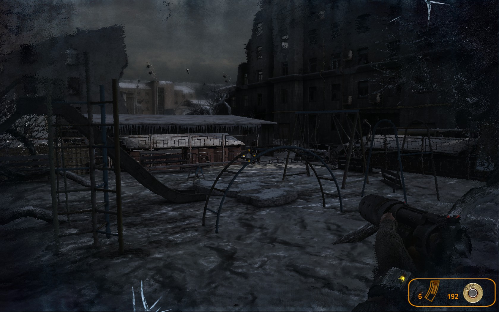 The game does something cool here, letting you do a bit of roaming around Riga. Innocuous tests of character appear in your path: a beggar asks for a single precious military-grade bullet, a prostitute solicits your attention, and a little kid offers to lead you (for a price) to a man who has a business offer for you. These little meetings are entirely possible to miss, and take place without your knowledge they’re shaping who you, Artyom, are as a person. Are you generous? Do you steal? None of them have an immediate effect, and as such they’re easy to write off as inconsequential—and still, there they are, seemingly included in the game without purpose. We’ll return to this a few times in future acts, since this is Metro 2033’s most brilliant mechanic, even if it’s currently invisible.
