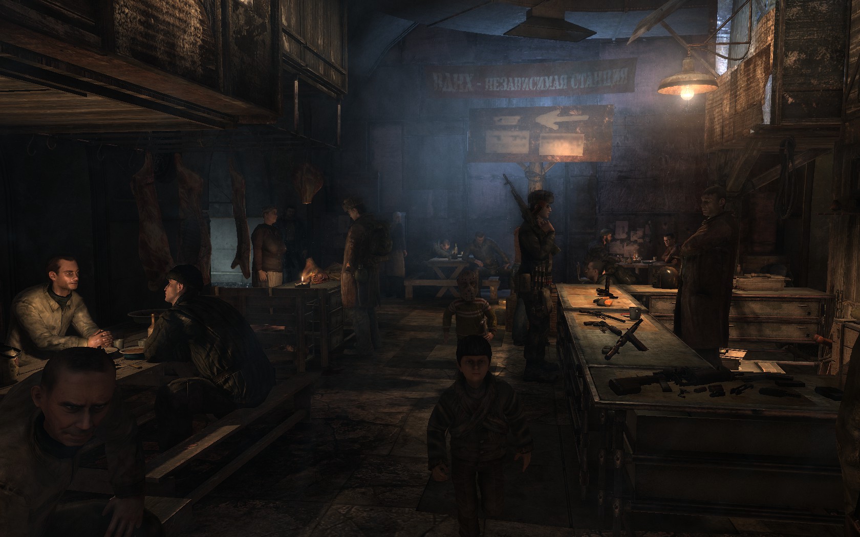 So after Metro 2033 gives us the requisite action intro (consisting of your character surviving a mutant attack on the surface near the end of the game) to grab you by the shoulders and convince you to sit through the following talky bits, it begins proper with some images of civilization: the Big Ben, Venetian canals, the Eiffel Tower, Pyramids. Then the frame pulls back and we’re shown that these are postcards, echoes of the not-so-distant past. The room is a cramped apartment lit by lamplight, with walls of cardboard, rug, and wood, cushioned train seats for a bed, and clutter stored on a portable metal table and homemade shelves. You can hear the murmur of human living through the flimsy frame of your room, and outside your sliding door are dozens more apartments, lined side by side in front of brick and concrete walls that are blank except for ancient graffiti. This is the Moscow Metro, where around 40,000 souls go about their lives after the world has ended.