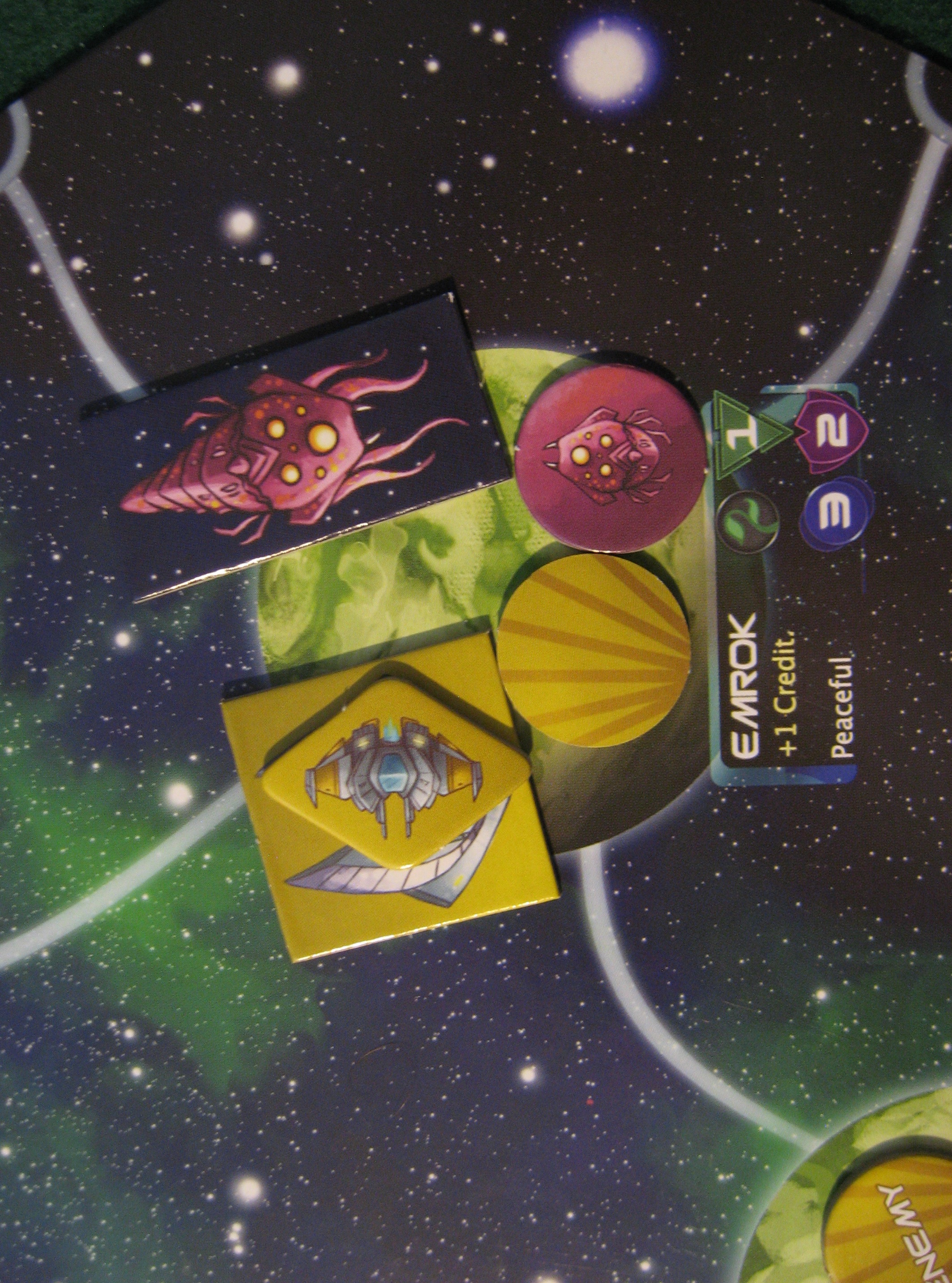 All the while, on the other side of the galaxy, the parasite player is annoying the Nomads of Earth by infesting all their planets, thus gaining their racial special abilities without needing to actually ally with them. It looks like a second war will break out within a couple rounds. Neither one has a strong military, but they’ve been growing fat off of bribes and peace. Both players are sitting across the table and glaring mightily.