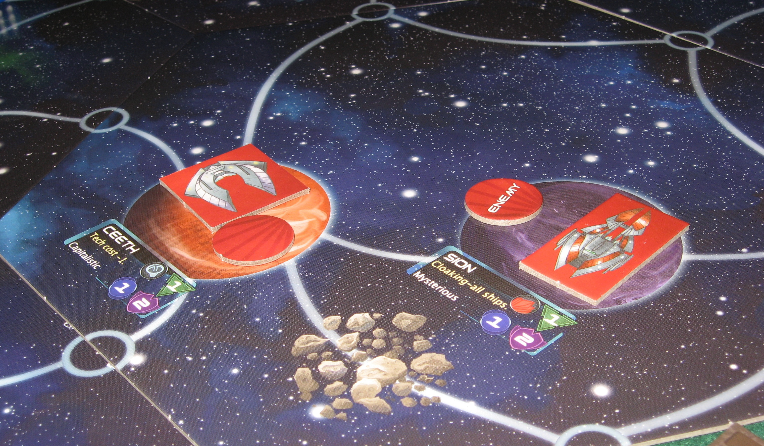 First, you pick a race. The game comes with eight of them, and they’re each different enough to have their own feel and a nice bit of theme, while being similar enough that nobody is going to get overwhelmed and run from the room in tears. For the most part, these races inhabit well-worn niches: you’ve got parasites (shown above) that can infest planets to gain the locals’ special bonuses without having to actually talk to them, robots that excel at production and fail at diplomacy (thank goodness nobody designed Empathy Bots), or academy lizards that are good at science and not much else; as well as a few races that break the mold—for instance, the human faction is a bit more interesting than the middle-of-the-road designation that terrestrials are usually relegated to. Here, they’re inhabiting a wasted Earth, and, as a result, have honed the skill of mooching off of the more egalitarian-minded planets of the galaxy.