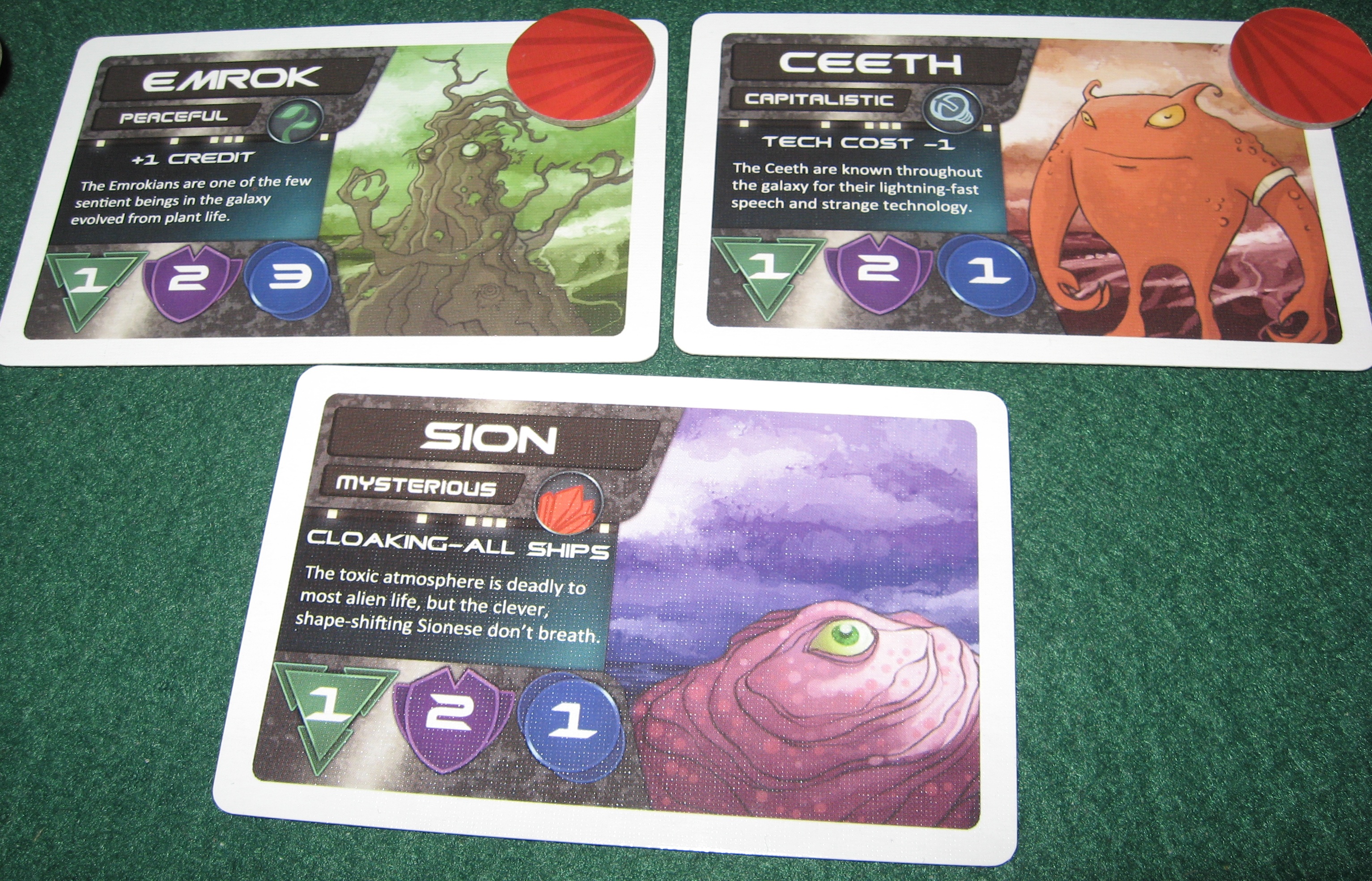 The green triangle is the amount of credits the race provides, the purple wingding thing denotes the planet’s victory point value, and the blue circle is that race’s influence with the galactic council based on Pyrious. In addition, each planet provides a special material (artifacts, crystals, lifeforms, metals, and gas) that can be traded or used to research locked technologies, and a special ability that can range from extra cash to extra ship abilities to new types of powerful ships for you to construct.