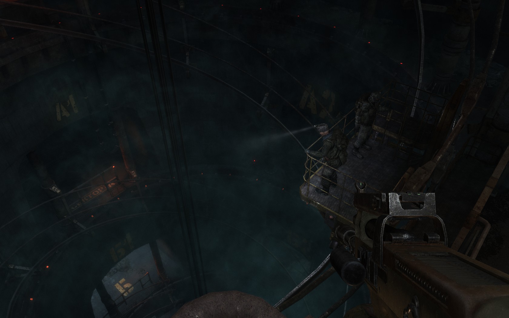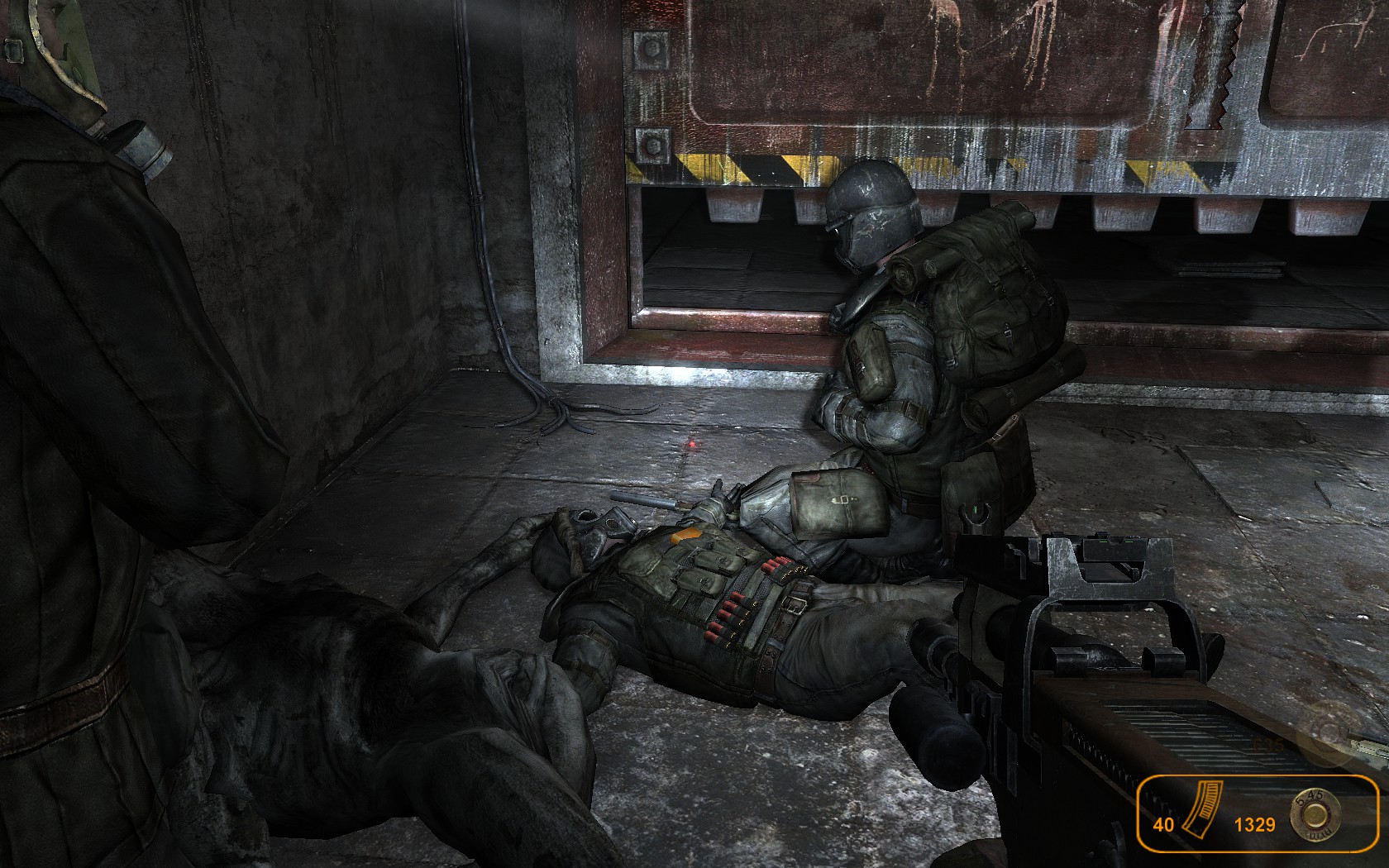 There are six of you. Miller has come along to oversee the mission personally, which is really cool of him to do, even though he’s sort of a grump. Ulman is there, cracking jokes per usual, and it’s nice to have him around because Miller is all business and you two have been through a lot together anyway. There are also three others, who you haven’t had the pleasure of meeting before. Vladimir isn’t armored as well because he’s a technician, and as such his job is to work the D6 missile computer. Since he’s essential, the plot will keep him safe. The other two are Stepan and Boris, and they reek of redshirtery. Sure enough, as you battle past a horde of mutants to get into D6, both of them die.