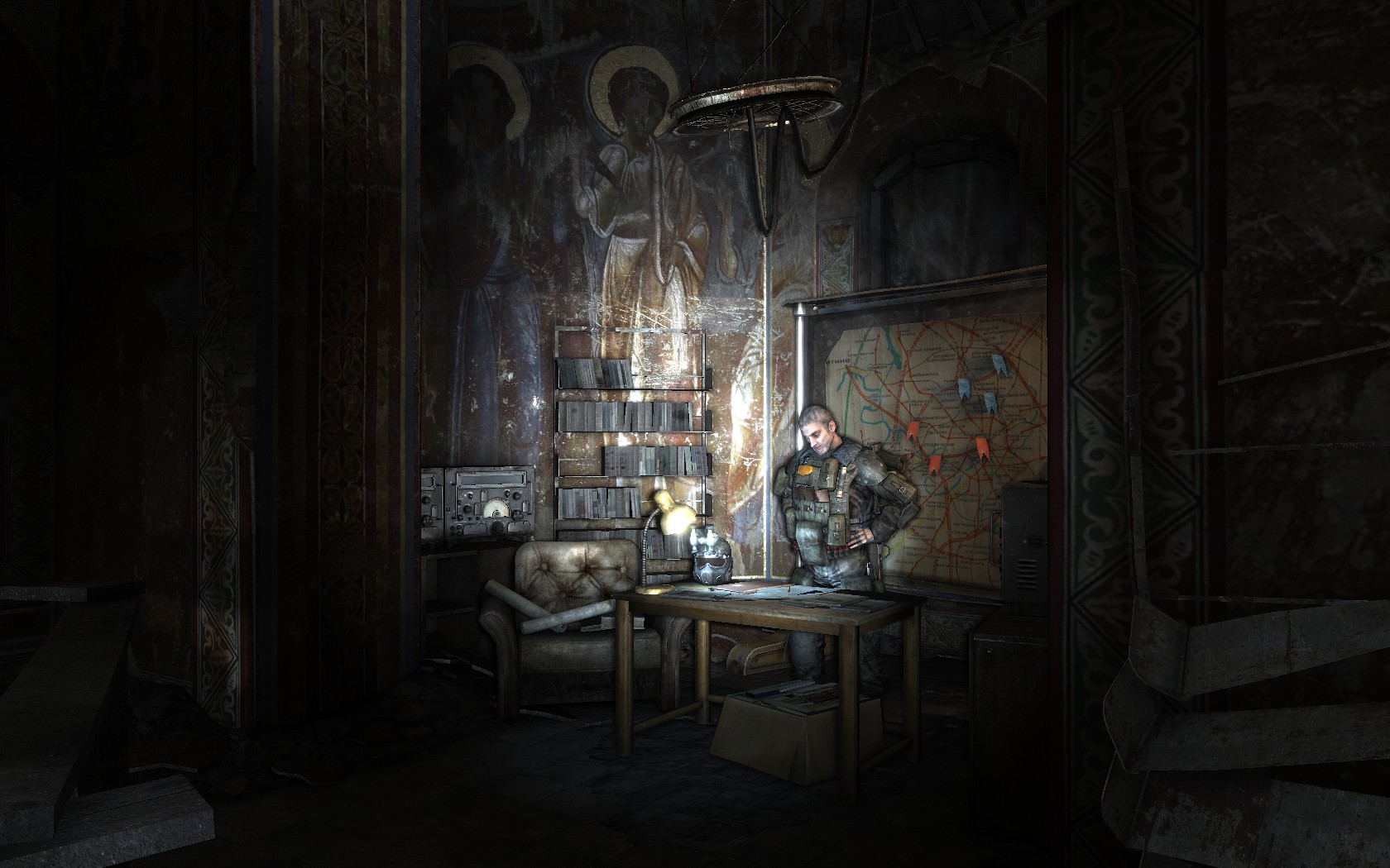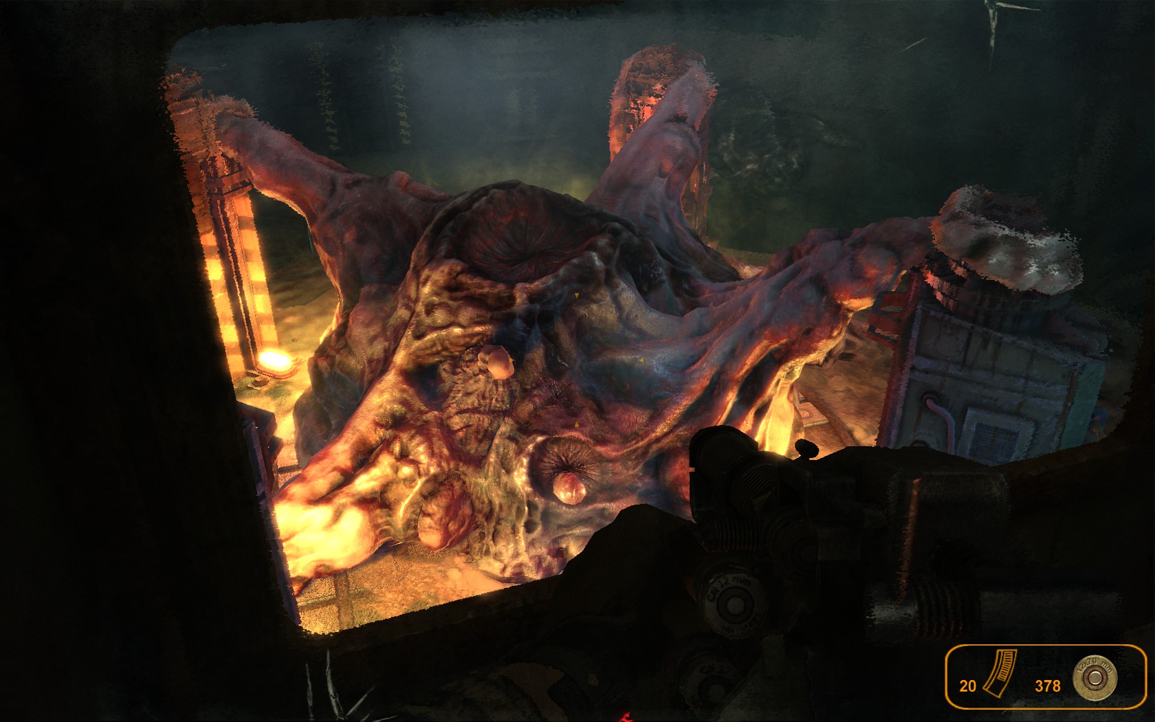 Act Four begins with Artyom successfully completing his original mission to reach Polis and tell them about the Dark Ones that are invading his home station. We know this can’t be the end of Artyom’s story, not only because then the game would have been shockingly short and lacked any real endgame climax, but because the opening scene of the game was of a desperate windswept battle against a horde of mutants at the base of a mysterious tower. Act Four is all about getting Artyom there. It’s the closest thing Metro 2033 has to a “filler” chapter, and even then there are still plenty of disturbing secrets to unearth and dreadful locations to visit.