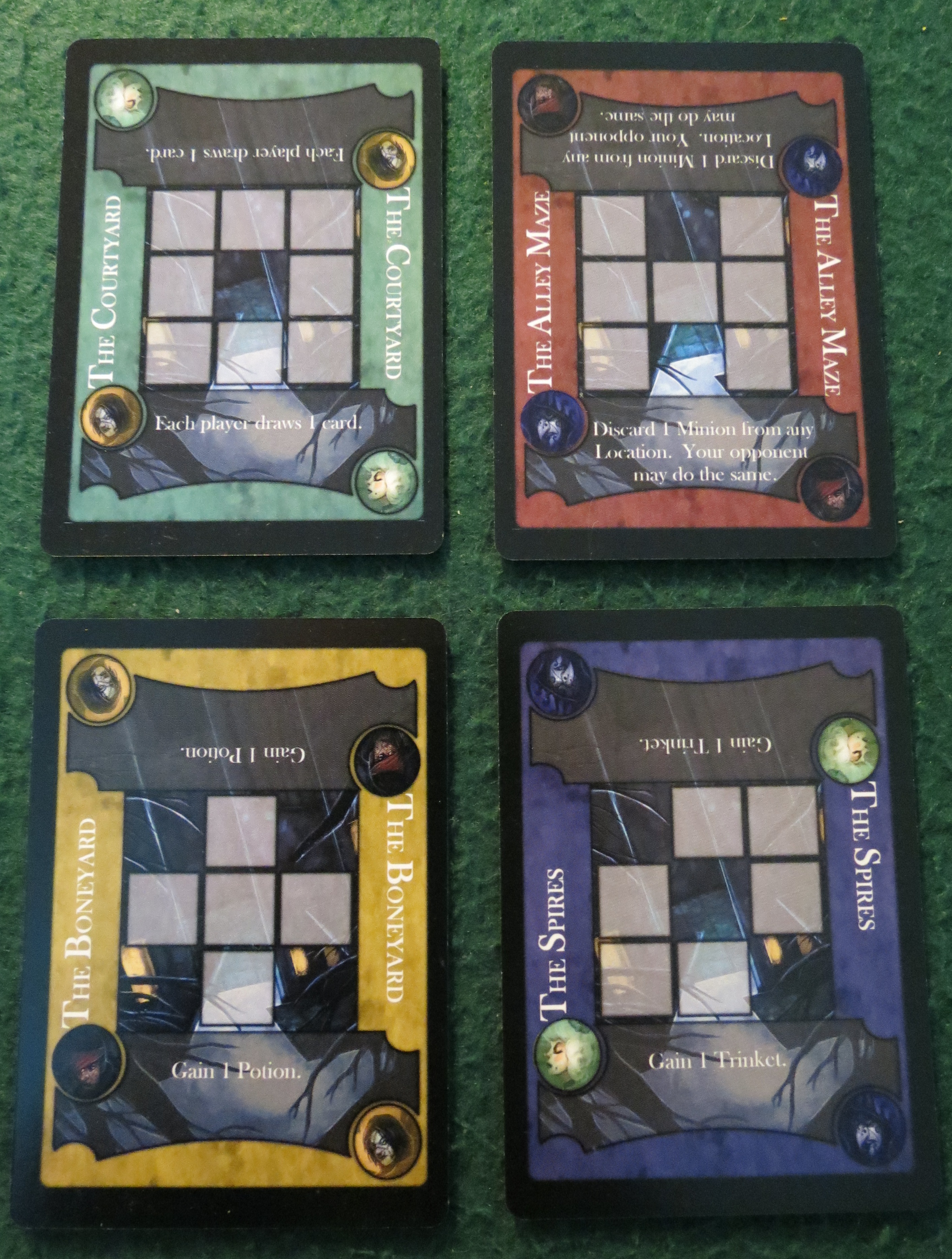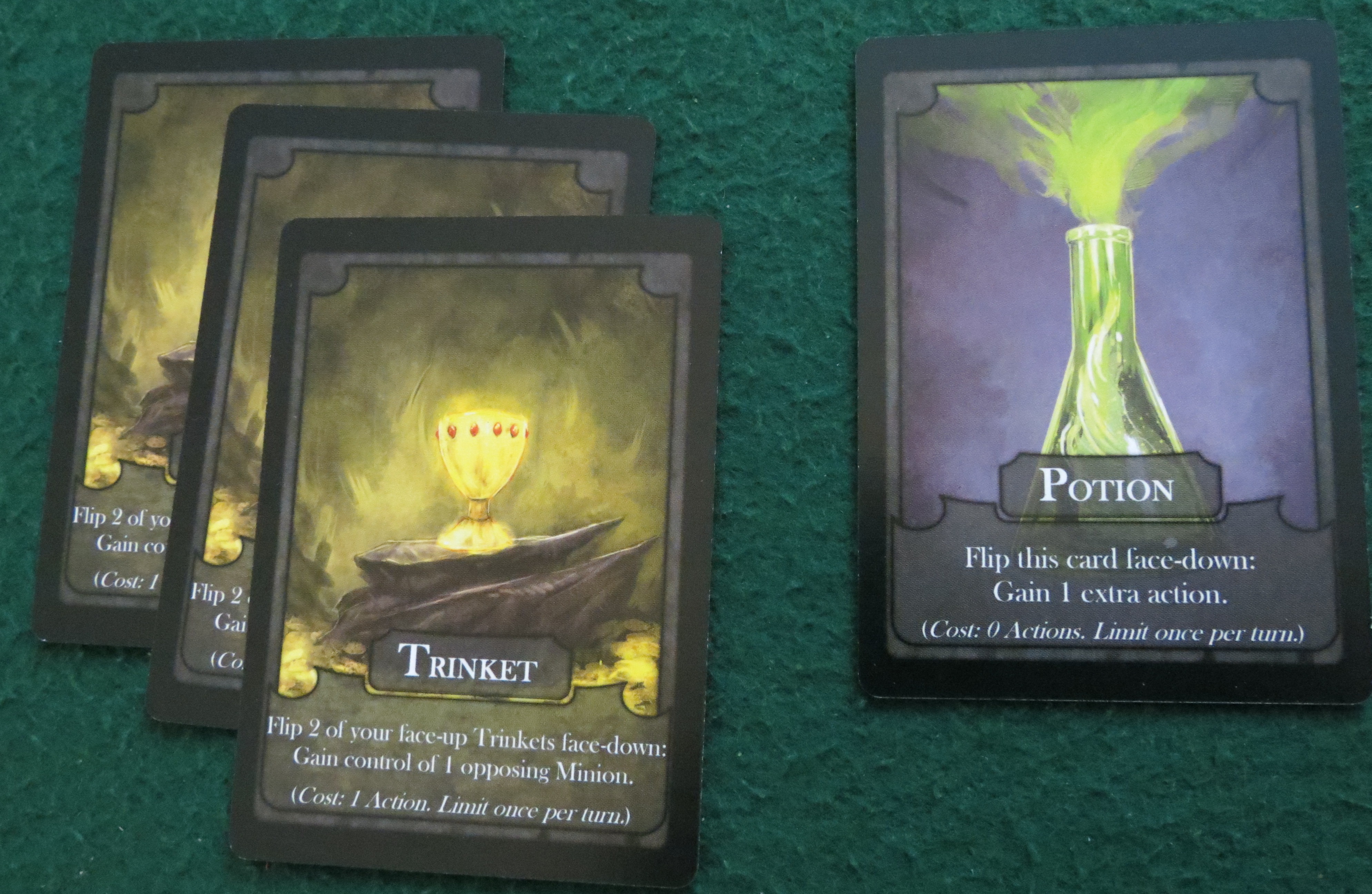 There’s one other aspect I haven’t mentioned yet, and it’s also the other way to score points. Certain of your minions will be able to earn you trinkets and potions, whether by their own ability or by activating a location’s ability. These are worth two points if you have them face-up at the end of the game, but you have the option to use them, at which point they’ll be flipped face-down and only be worth one point. This might sound like a raw deal until you realize what they can do—a potion can give you an extra action, or you can use up two trinkets to bribe an enemy minion into joining your side. When you’re low on influence in a critical district and you’ve got both a Day and a weekend check coming up, suddenly the prospect of stealing away your opponent’s most influential minion can be mighty tempting, and damn the loss of a couple of points at the end of the game.