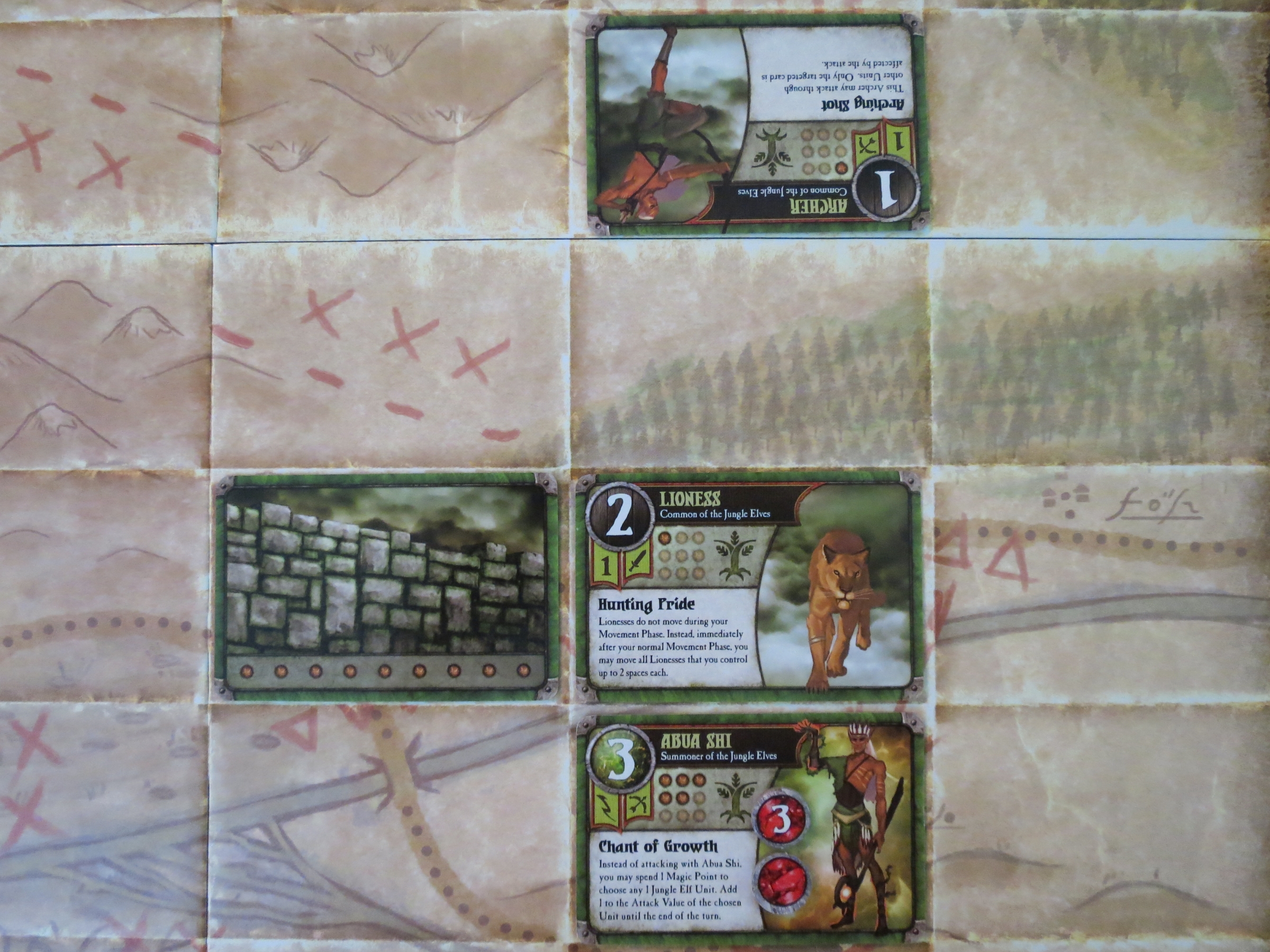 A friend and I were playing a Jungle Elves mirror match. He was new to Summoner Wars, but had been doing pretty well. It was his first time playing as the Jungle Elves, and as luck would have it, they’re the team I picked as well (I realize this makes it sound like I always play the J.E., which isn’t the case). At the end of the game, we’d both collapsed each others’ left flanks, so he was threatening my copy of Abua Shi and I was threatening his (yeah, I know it’s nonsense. I don’t like mirror matches very much, just from a thematic standpoint). Both had taken a few wounds. I needed to land one more hit to win. I had an Archer in range. He didn’t want to risk moving up his Summoner for fear of me summoning something to kill him on the next turn, so he summoned a Lioness to block my attack. Unfortunately, the Jungle Elf Archer’s ability is “Arcing Shot,” which lets him shoot over units. So one lucky shot later, I was the winner and my friend was peeved that he could have survived by just moving Abua Shi one space to the left, where he would have been protected by his Wall.