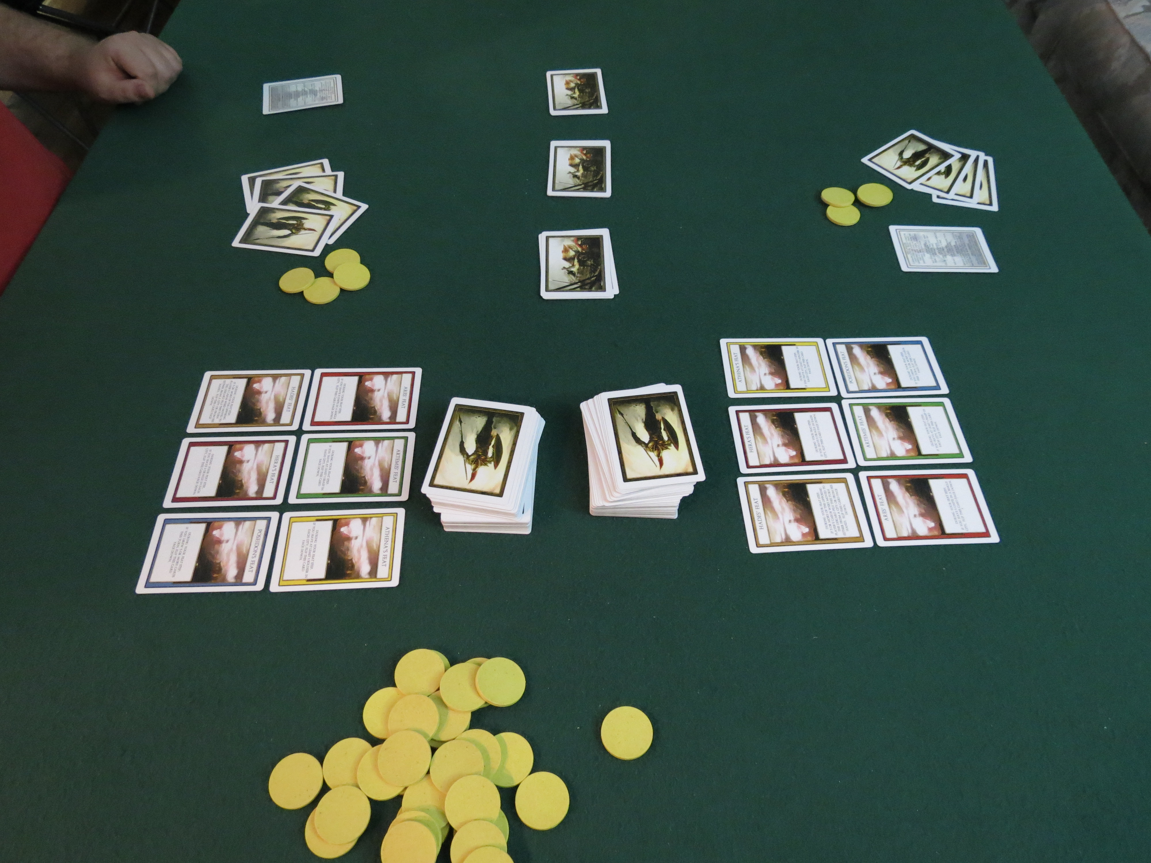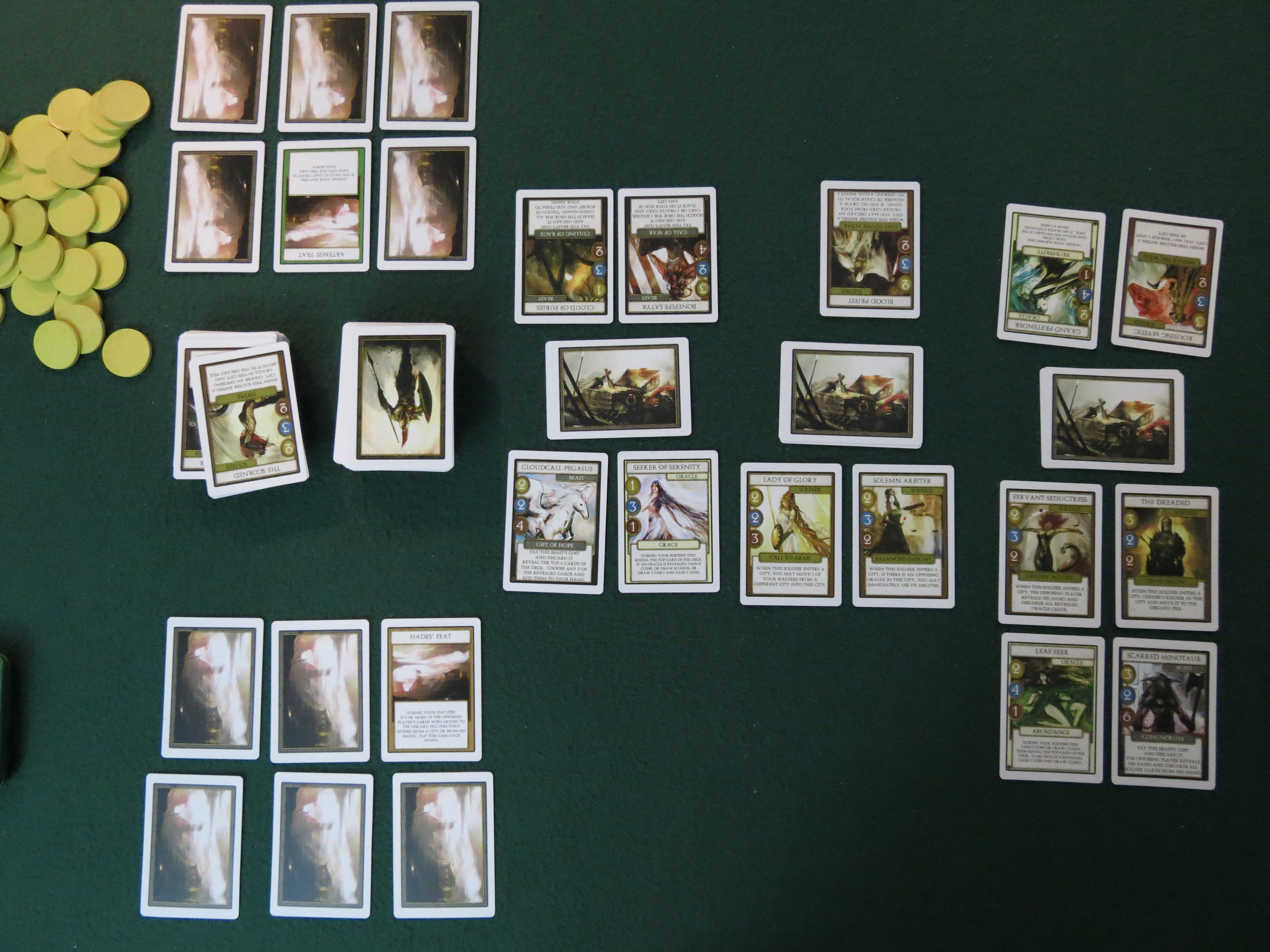 The game setup is nice and simple. Two players sit opposite one another, with three stacks of four fortune cards between them. Each of these three stacks is a city, and it’s into these three locations that you’ll be playing your units. Additionally, you both have six face-up feat cards in front of you, as well as a hand of four unit cards and four coins. Between you sits the draw deck.