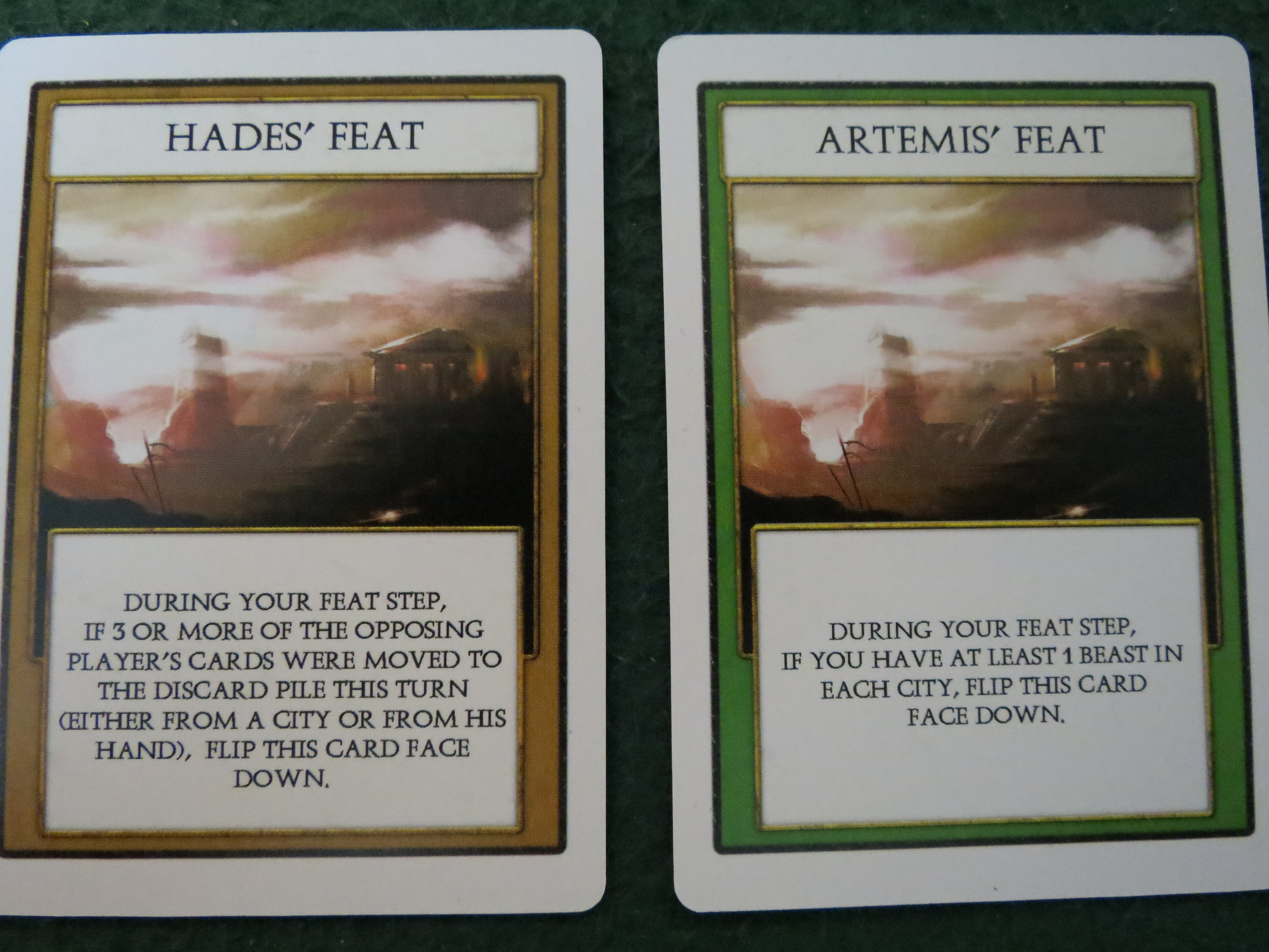 Now you check to see if you’ve accomplished any of your feats, flipping them face-down if you have. These are worthwhile goals to strive towards, and much of your strategy will revolve around turning over as many of these as you can while blocking your enemy from doing the same.
