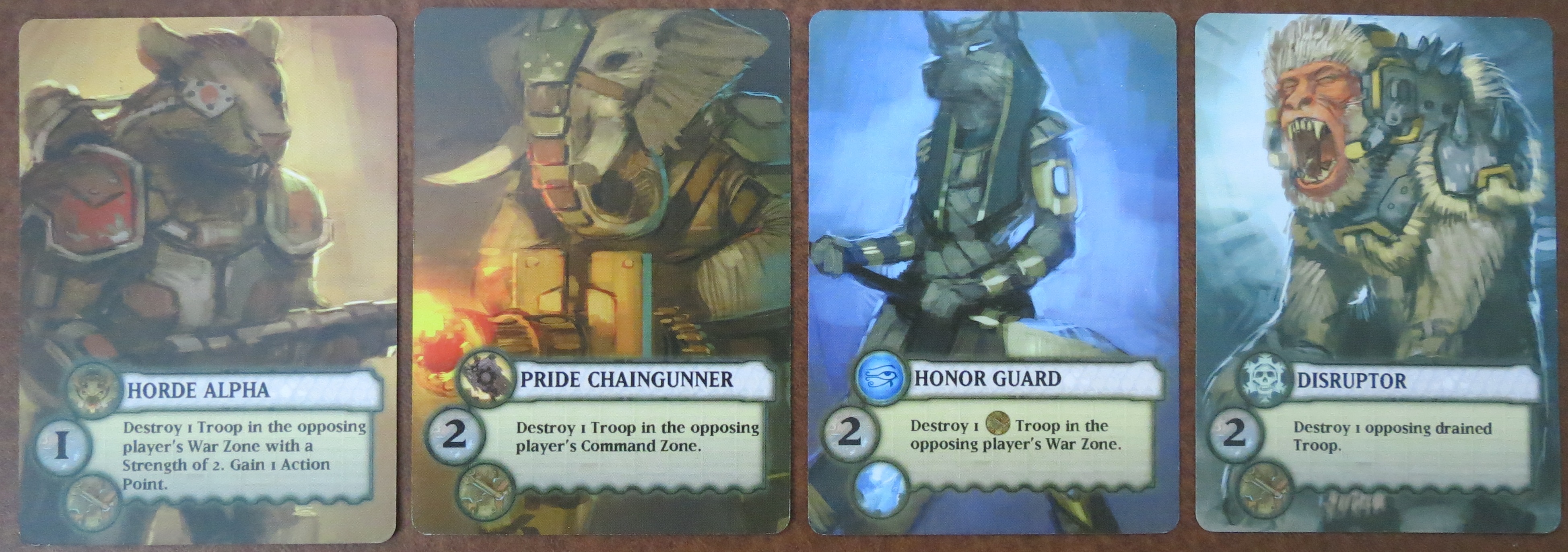 Additionally, since you can only refresh a single troop in your War Zone per turn, unless you’re one of the factions lucky enough to come with a command ability to refresh those troops in greater numbers, you’ll need to constantly play more troops in order to deal your opponent more damage per turn than they’re dealing you, and then you’ll often have a fair number of perpetually drained troops just sitting around. Or, heaven forbid, if you’ve reached and drained your maximum number of six troops in your War Zone, there might be nothing you can do at all, since there isn’t any provision for disbanding troops or getting rid of your own guys, unless again you were lucky enough to have one of the rare factions with that type of ability.