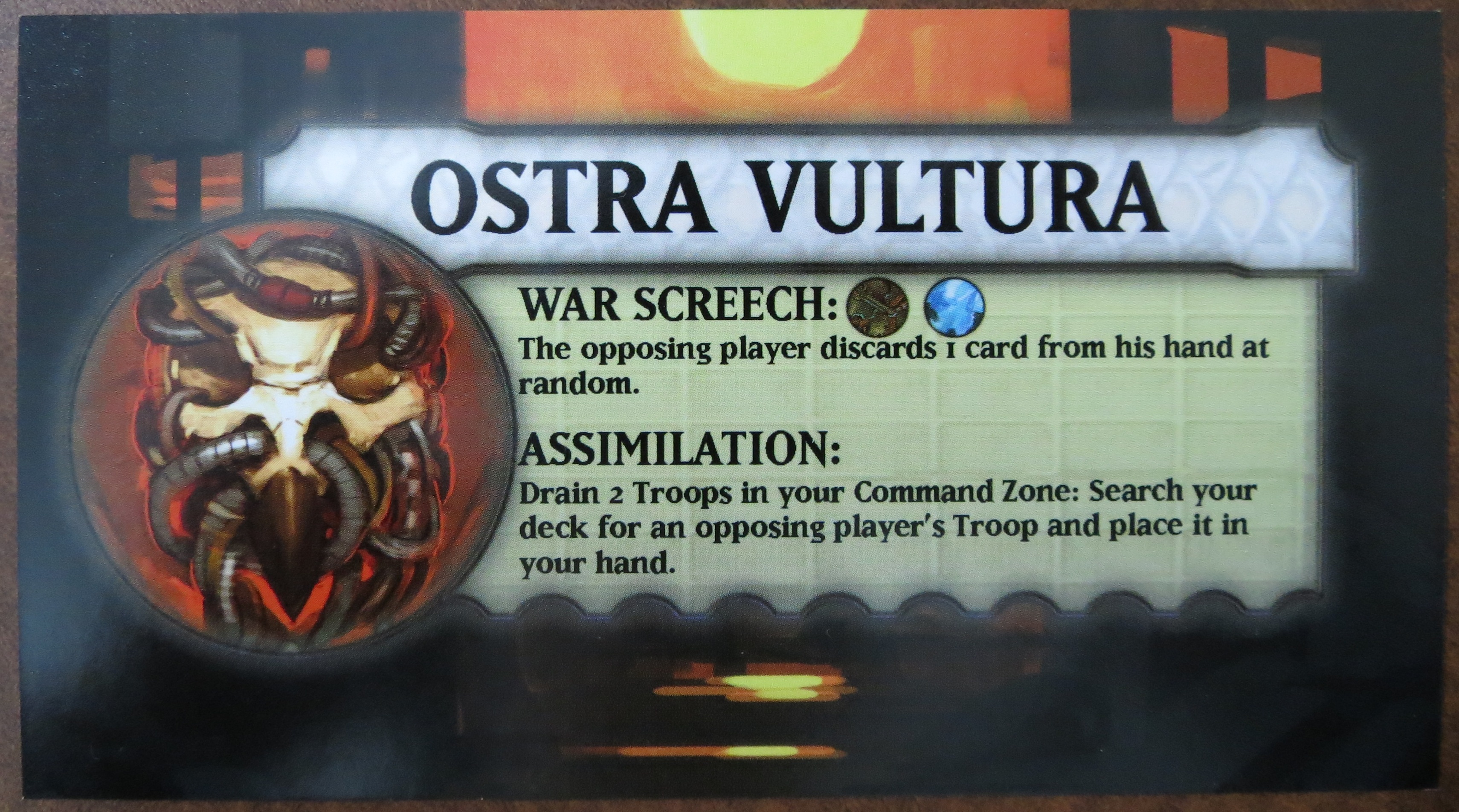 Already you’re presented with a wealth of information, but none of it is especially complicated. Your troop cards consist of their faction symbol, strength value (usually 1, though a few troops have 2), troop “type” (either arcane or tech), and a command ability. The command cards have two parts to them: the first is the criteria and bonus for making a formation attack (in the above image, the Ostra Vultura formation attack requires one tech and one arcane troop, and forces the opposing player to discard a card once pulled off) and a special ability you can perform with the troops in your Command Zone.