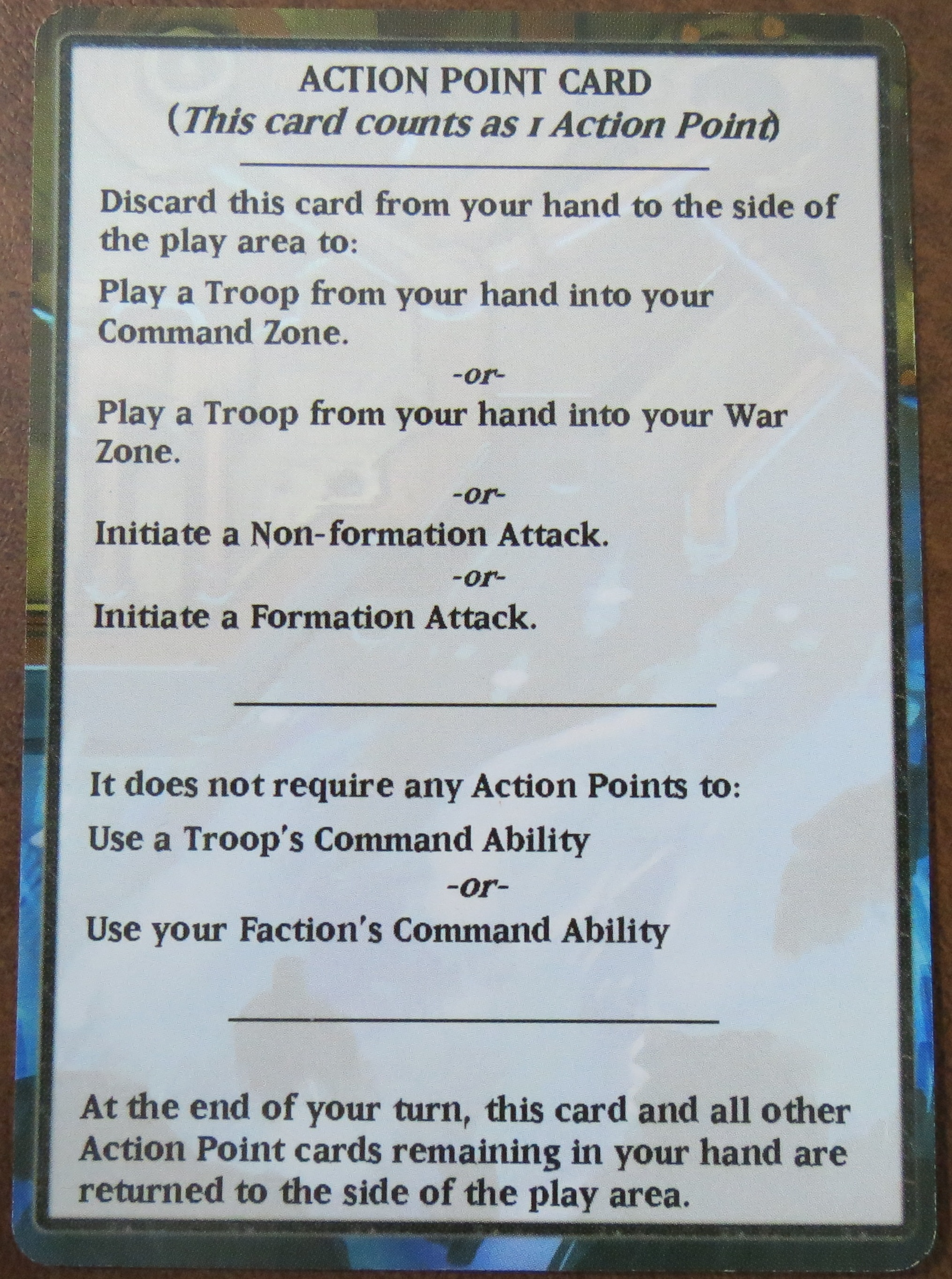 The game is played in two steps. During the Recharge Step you refresh any drained (tapped) troops in your Command Zone and one troop in your War Zone, then draw one card from your deck and get one action point card (this is something I like about the game. Your action points are represented by cards, each of which has a full list of all the actions you can take on it. This is a superb idea, since it cuts out the need for a separate reference sheet and action tokens), plus an extra action or card for each troop in your Command Zone. So in the above picture, you’d draw one card and get one action, and then you could choose twice between another card or action.