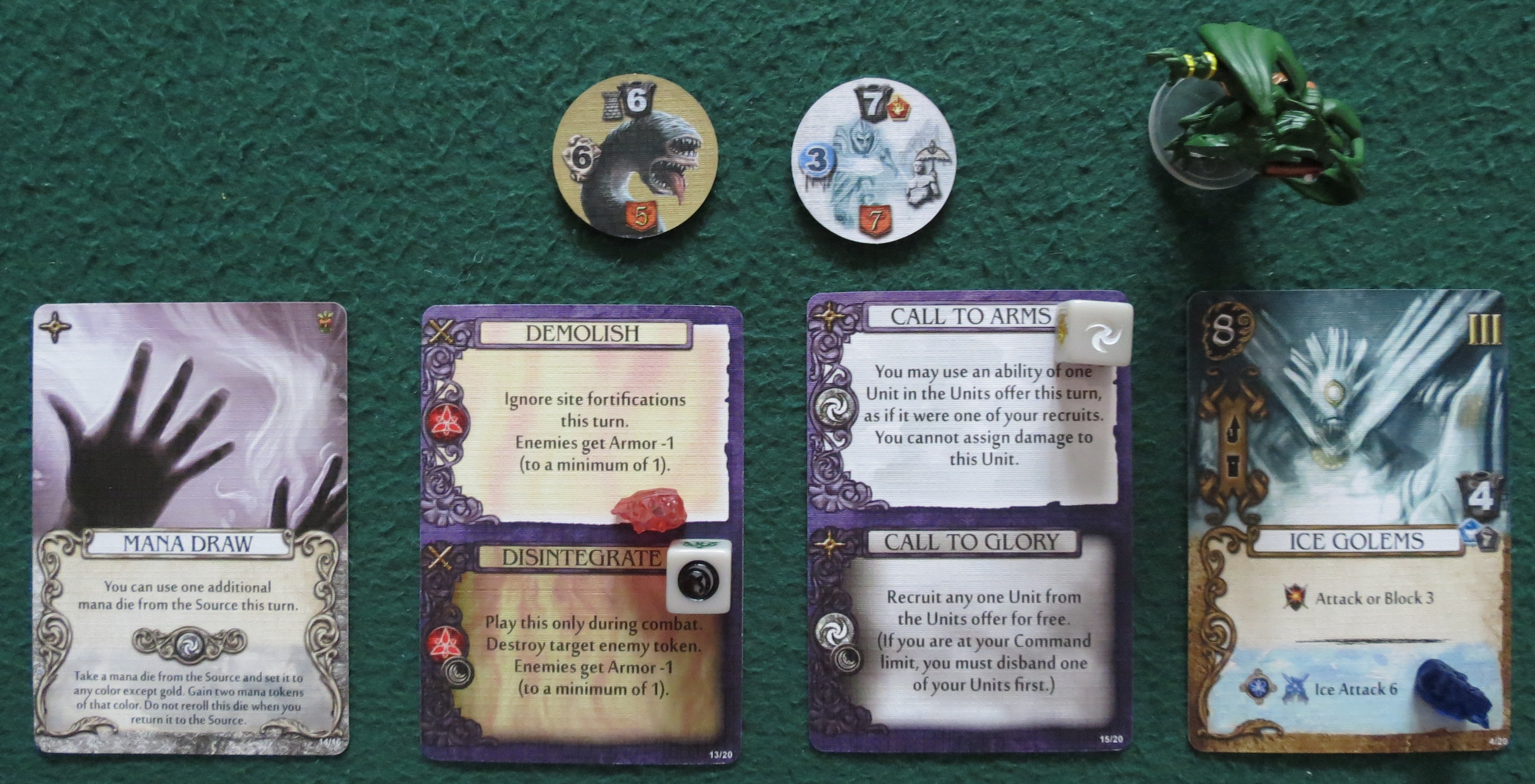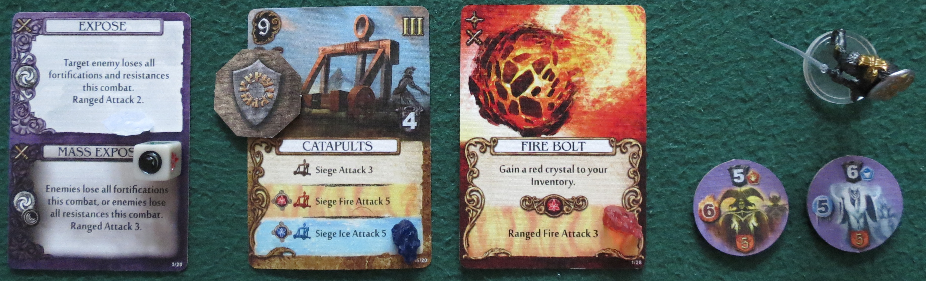 One of the reasons Mage Knight appears so immensely difficult is because you've got a whole bunch of STUFF. There are action cards for each character, advanced action cards, wound cards, spell cards, artifact cards (and all of these with the same back, since the game is fundamentally a large and complex deck-builder), and two different classes of unit cards. You can see the difference between the basic and elite units above — the elite cards have a gold background rather than silver.