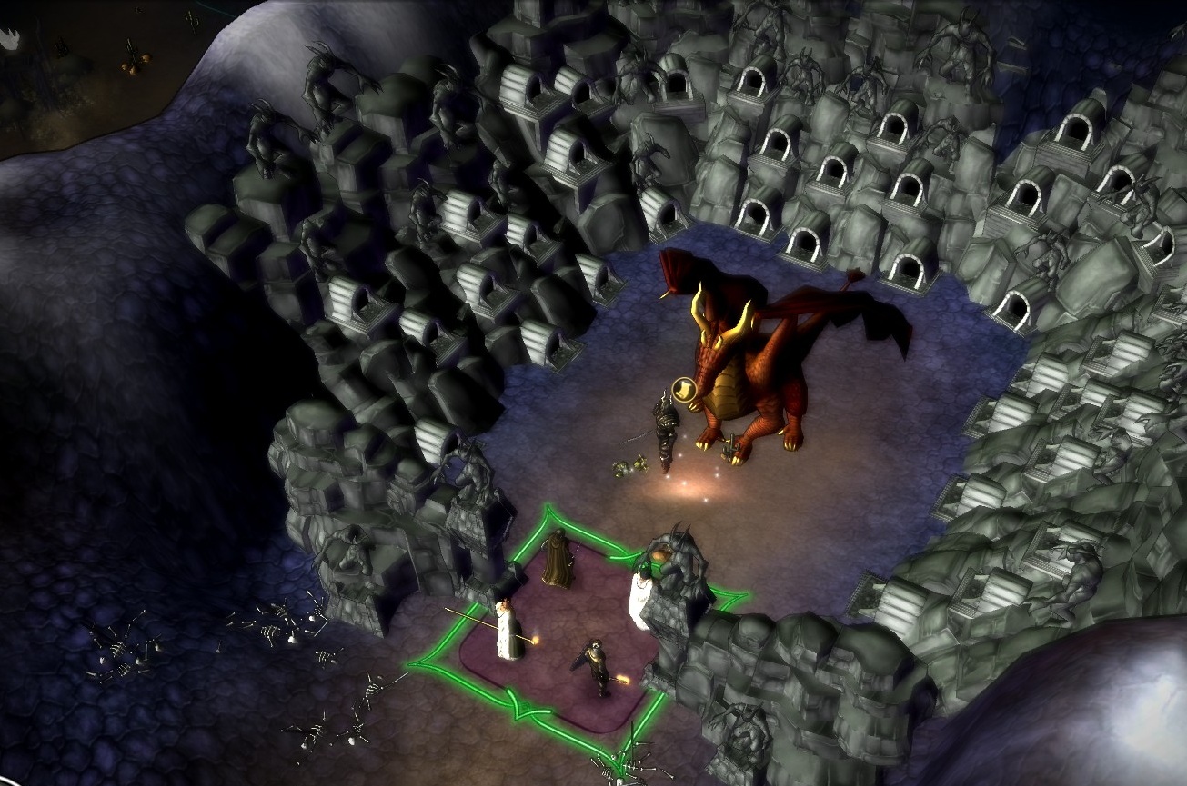 Getting through the final gate is no trouble at all (I just have to go kill something nearby), and at the center is a man with silly horns on his hat standing next to a dragon. He says some such’n’such about how he’s ancient, even older than Magnar, and he holds all sorts of power and blah blah blah. “Get on with it,” Magnar probably says. I click past this new antagonist’s wall of text and jump into battle.