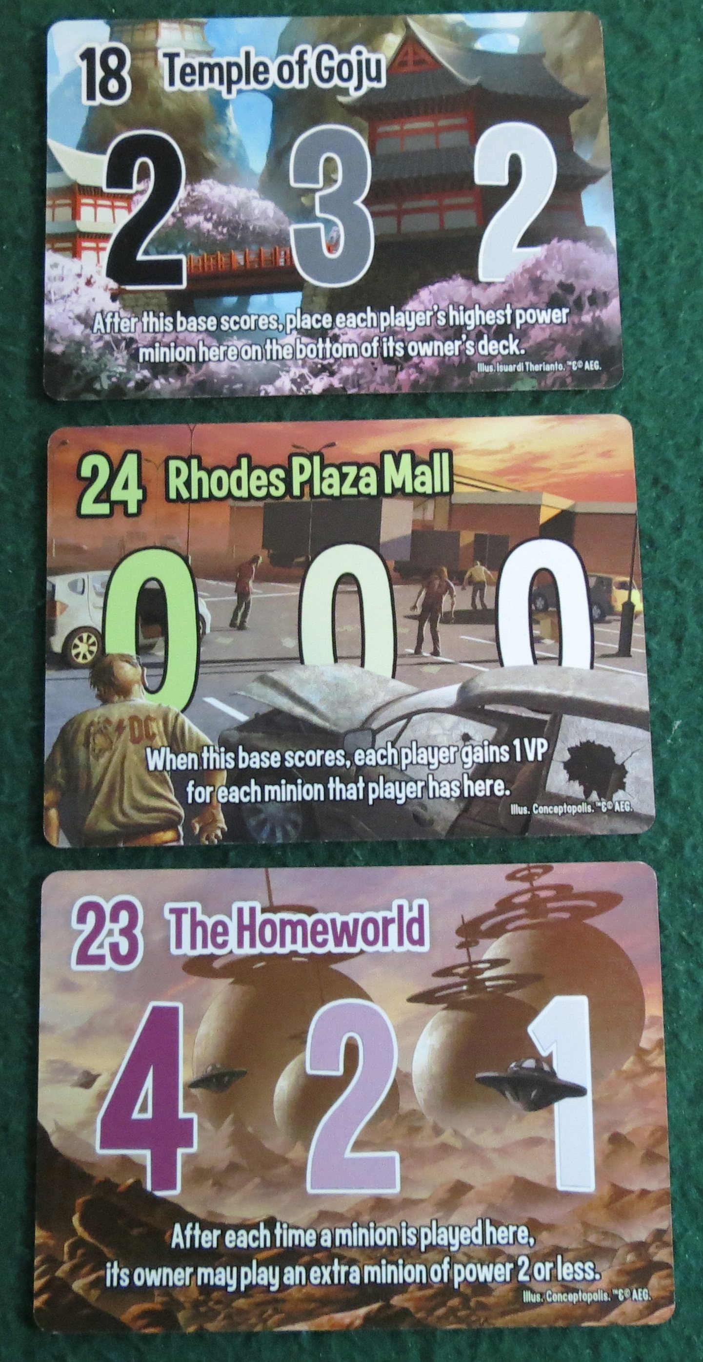 - Certain base cards reward a player for coming in second (see the “Temple of Goju” in the picture above). This might seem clever, but in practice it just means that nobody plays minions there. Some factions can shunt their enemies around, so perhaps it would be feasible to pile enemy minions on those bases until they’re busted and scored, but that’s such a rare ability that it’s unlikely.