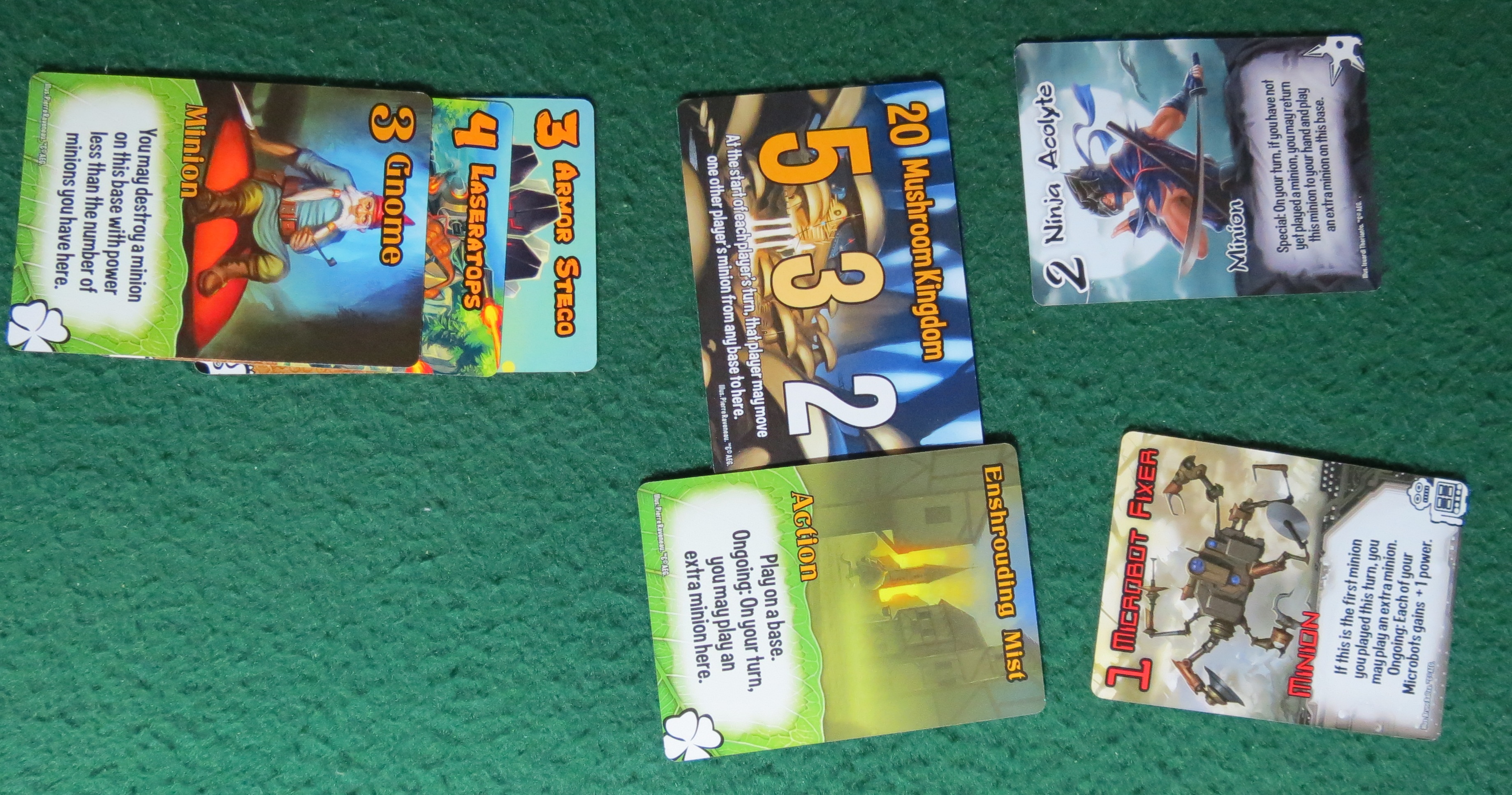 The order of play is similarly simple: on your turn, you play one action card and deploy one minion, check to see if any bases have been smashed (and thus scored), draw two cards, and the next player goes. That’s it. Breezy.