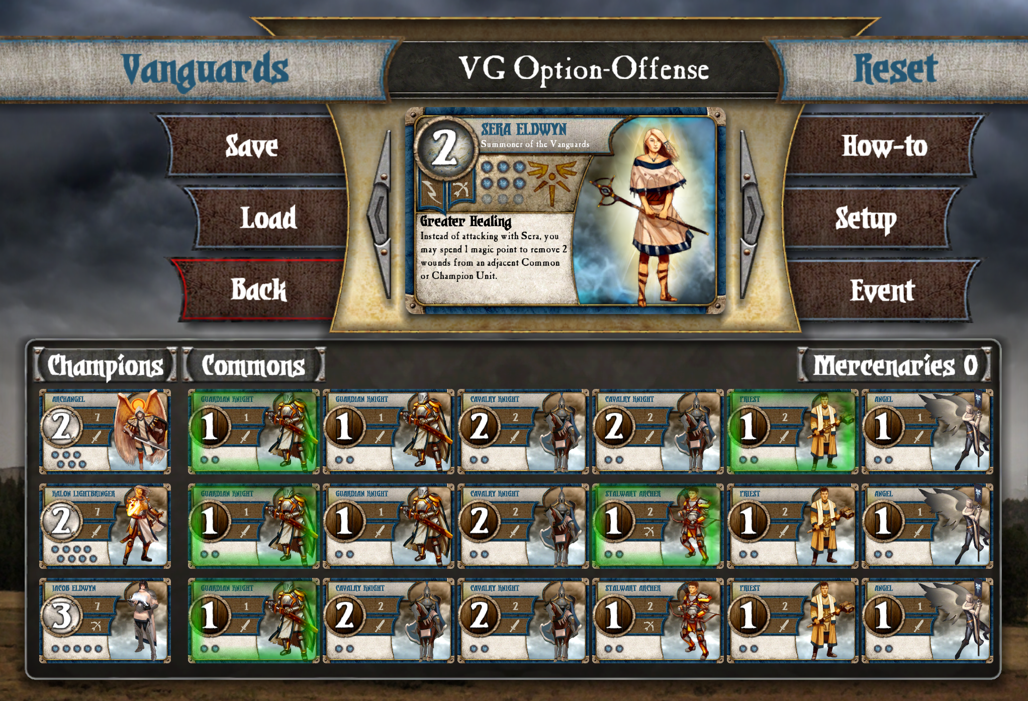 The Vanguards are the “normal” faction, the heroic knights and priests and angelic forces that stand against the tide of darkness, at least in the lore of Itharia. In practice, they’re every bit as likely to murder their own units for some extra magic, but hey, those are the times. The main thing you need to know about the Vanguards is that they’re usually pro defenders. All their common units have two life points, and they’re one of the only factions with a reliable way to heal their troops, which lends itself well to solid formations around healing priests. Not that I was planning on playing that way — in order to surprise my opponent, I’d constructed a tried-and-true assassination deck, designed to overwhelm my enemies with a wall of metal and horseflesh. I’d had good feedback too. Usually cusses and forfeits. Always nice.