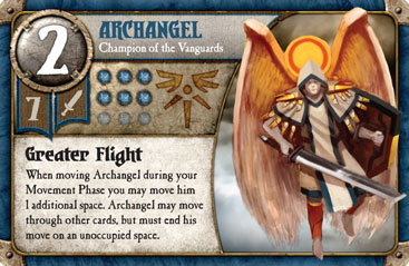 I had two in my hand, but I decided on Archangel. I’d already put three wounds on Grognack, and Summoner Wars is determined by whoever kills the enemy summoner first, not who wins the fancy maneuvering or the economy game. I mean, those things help, but it can be easy to lose sight of the prize. Archangel, with his ability to move three spaces and fly right over other cards, felt like the exact right tactic for diverting the enemy away from the middle, and perhaps landing a couple more hits on Grognack. So I spent the minor fortune to bring him into battle, then flew him over the entire skirmish. There he stood face to face with Grognack, raised his mighty sword, and landed a single hit.