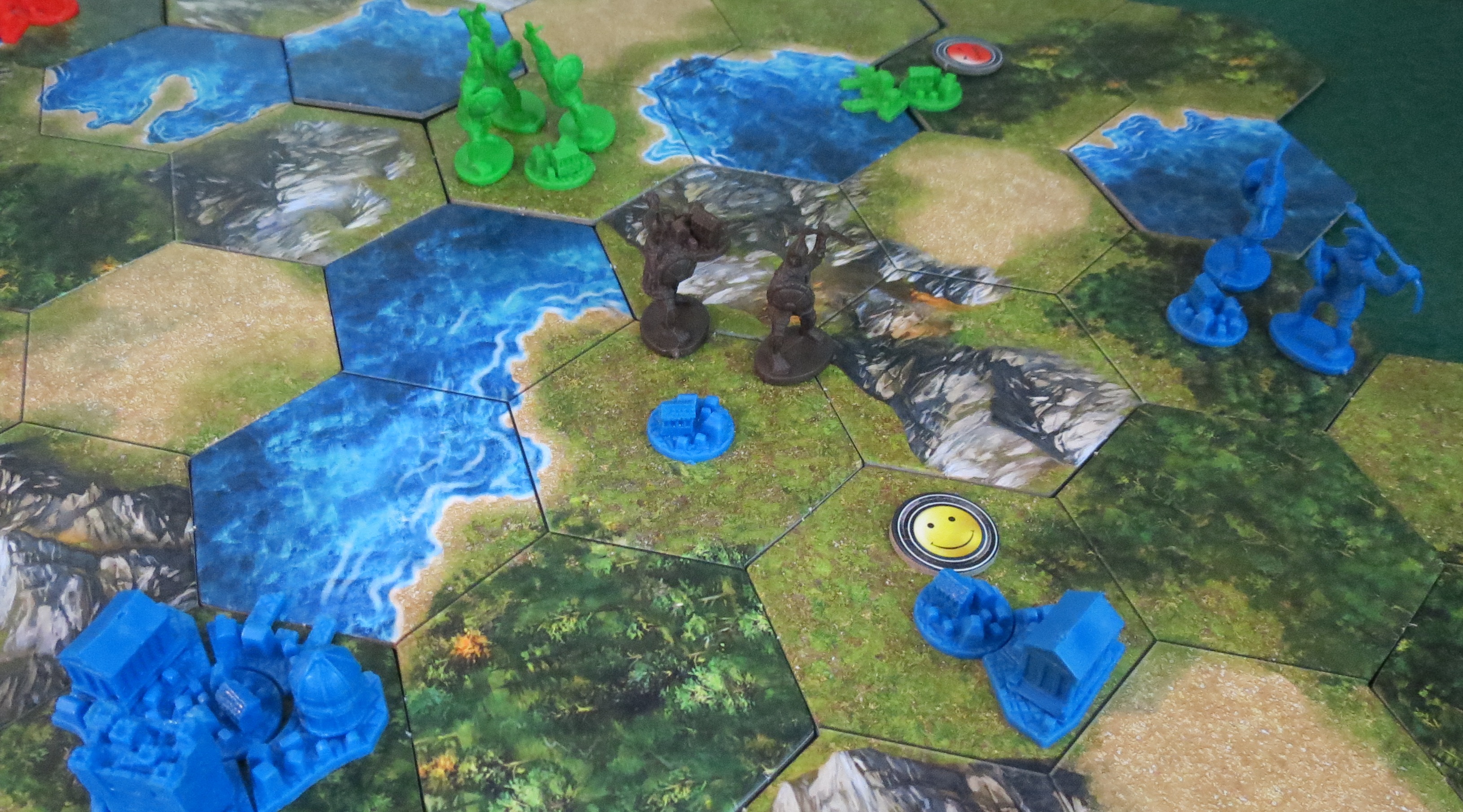 That little smiley face token up there isn’t just a subtle Watchmen reference, it’s an actual (awesome) mechanic. Cities have three mood states: angry, neutral, and happy. When a city is happy, it counts as +1 size when you activate it and collect resources or build units; when it’s angry, it always counts as size 1 for those same actions, no matter how big it is. If you activate a city more than once per turn, your city will decrease in mood to reflect the attitude of the citizens to being taxed or drafted too harshly. Fortunately, you can undertake Civic Improvement, in which you spend mood tokens equal to a city’s size to move its mood up a level. This means, of course, that it can be incredibly costly to make a huge city happy.