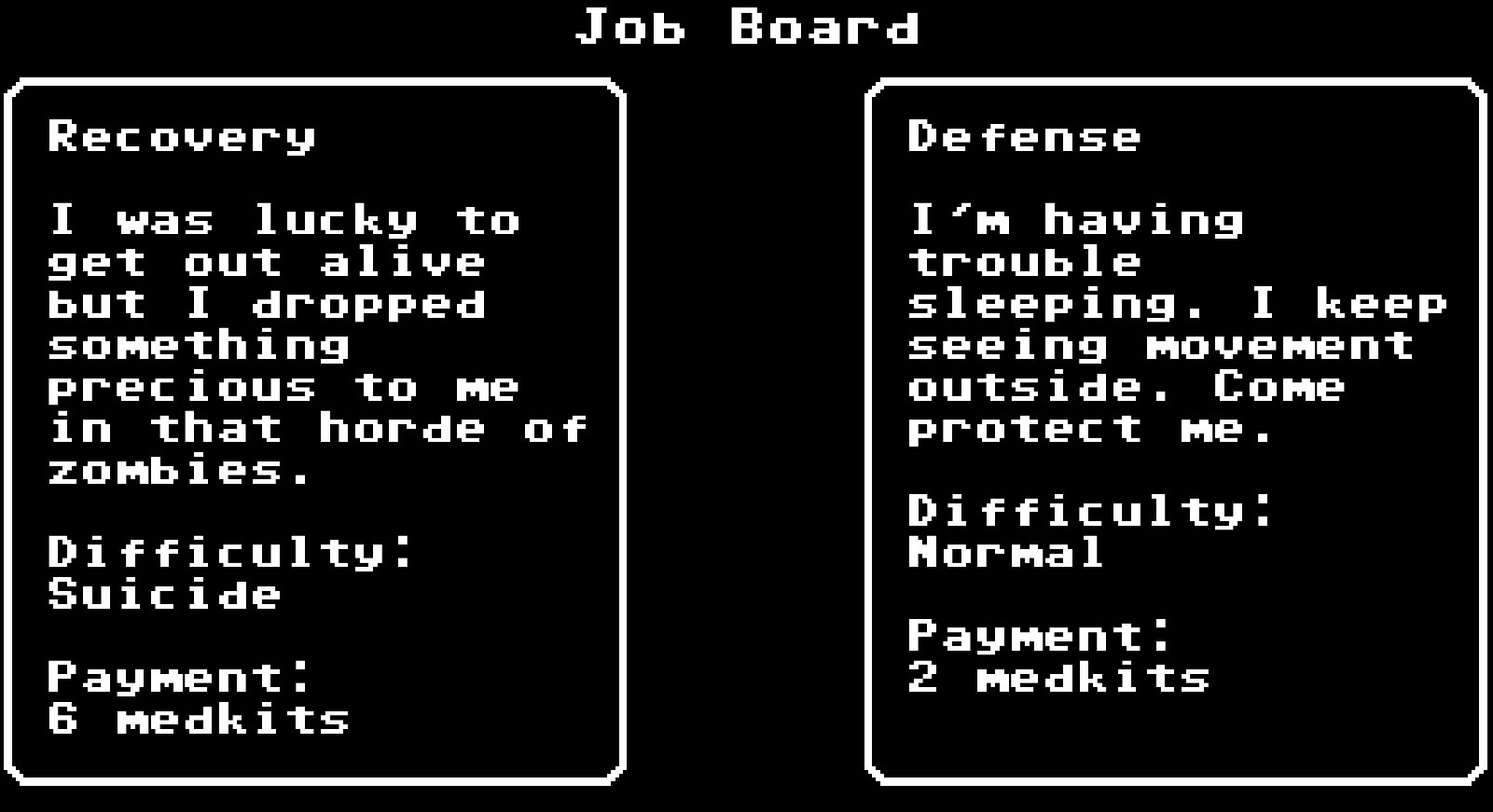Right in the center of the survivor haven someone had put up an old chalkboard for people to write down tasks they needed doing. It seemed like a smart idea at the time, though it turns out that everywhere we went someone had thought up the same thing, so either lots of people are smart or I just think normal ideas are a lot cleverer than they really are. Since around 90% of the population of Pittsburgh had been zombified by that point (that comes to roughly 276,000 zombies, which doesn’t sound like that many until you’re crapping your pants running from four of them), most of the jobs revolved around zombie removal. The first one was from a gentleman who had dropped something beyond the wall that separated breathing humans from human-eating undead humans, and the prospective employer had been kind enough to list the task of recovering the item as “suicide.” Thanks, but no thanks.
