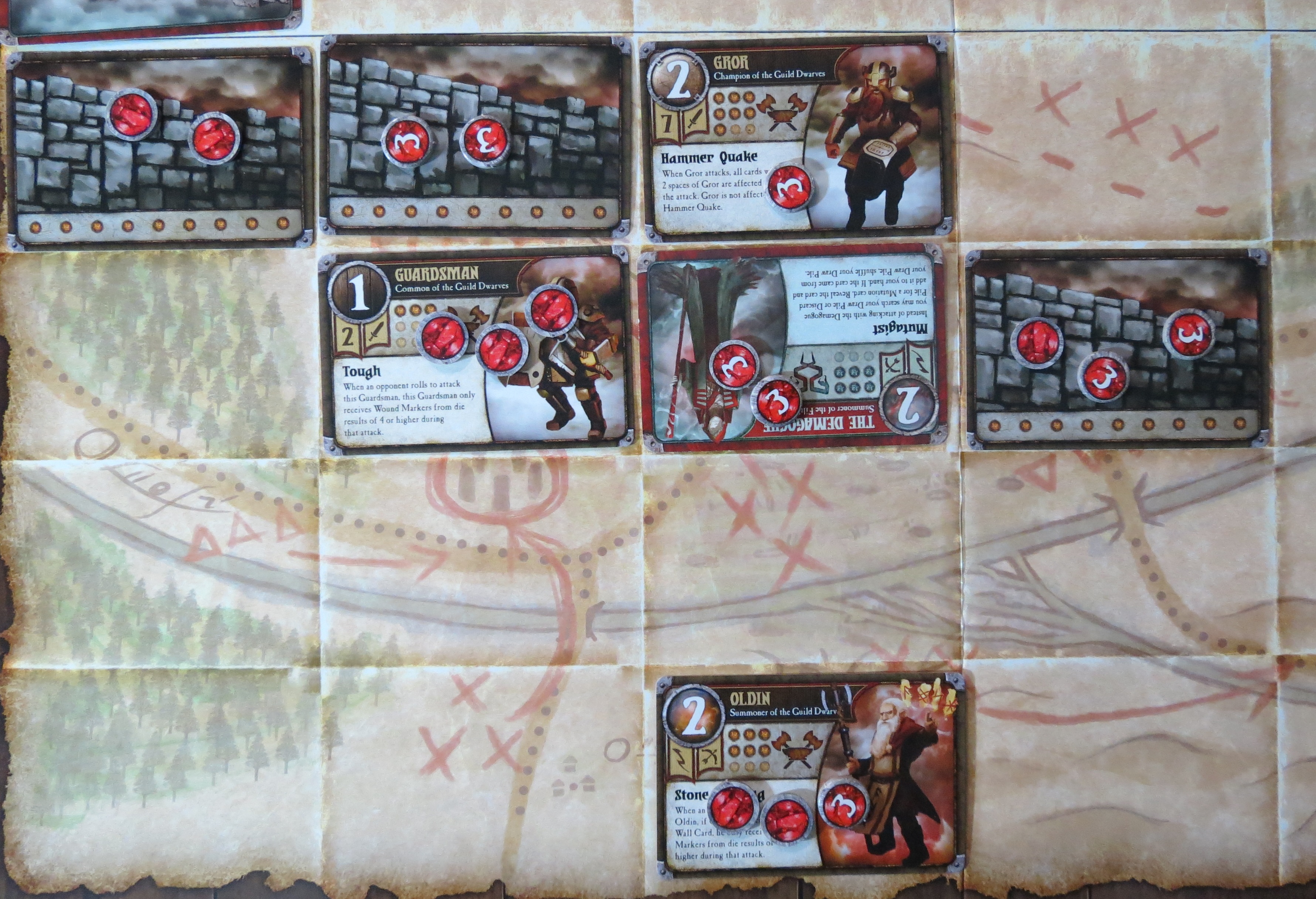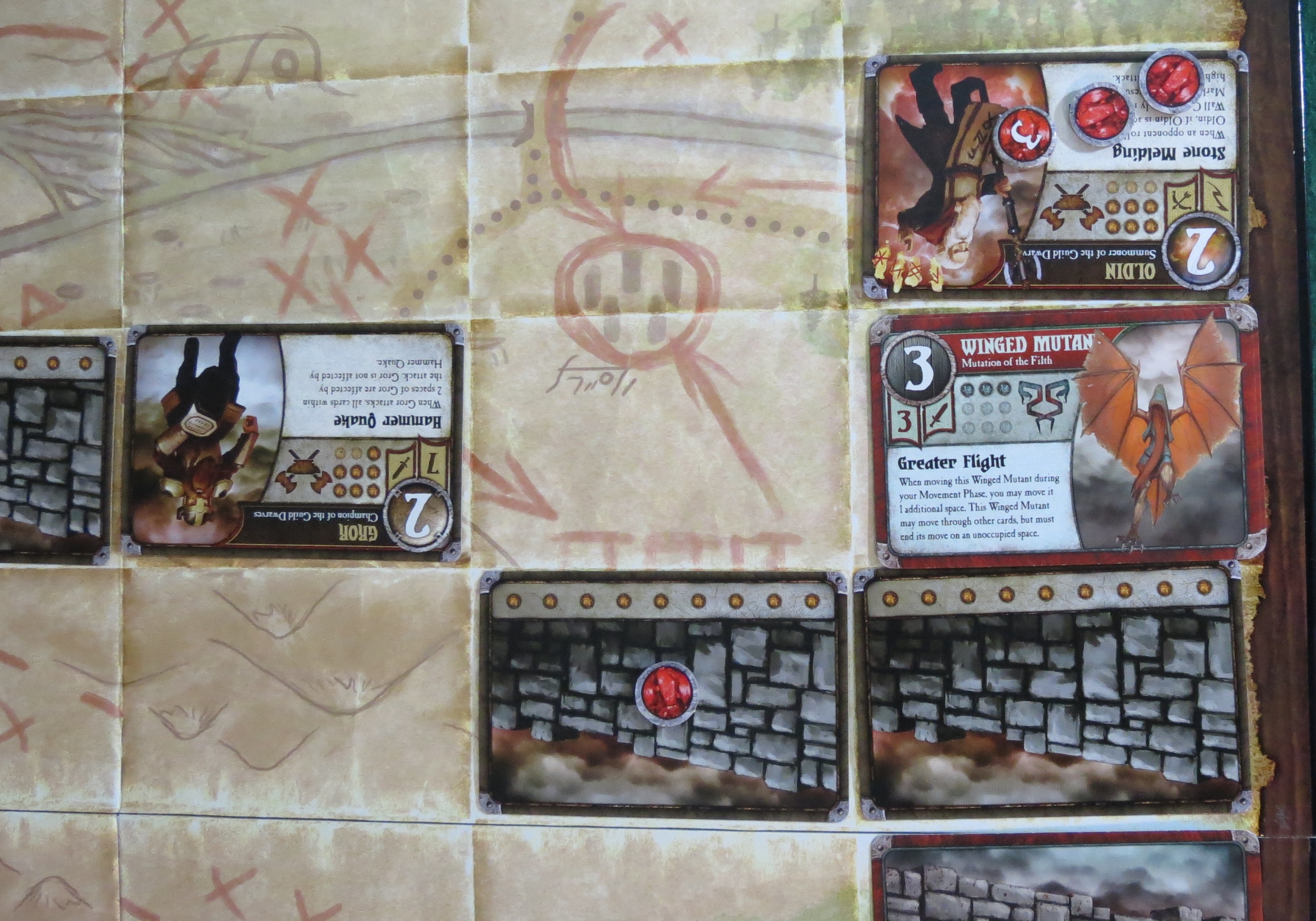 As expected, Somerset discards two cards from her hand to regain control of the Wall that I’d possessed, and summons Gror at it. He charges forward (probably with a heroic bellow) and to the south, and attacks my Anointed. Incidentally, his ridiculous Hammer Quake ability means he’s also attacking my Corpulent Mutant. He rolls 2/2, so it’s a good thing I’m holding onto a Shield of the Hopeful event to block the damage to my Anointed, and my Corpulent Mutant ignores the concussion of the attack anyway. In the north, a measly Defender manages to poke my Corpulent Mutant and actually wound it. I just may have to possess him or something.