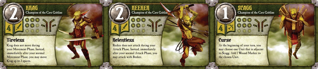 The coming match will be a contest of the few versus the many: while the Cave Goblins love to deploy their hordes of rabble to crowd walls and play gang-up events, the Swamp Orcs are powerful hunters that are tough and vicious, but rarely numerous. Many people consider the Cave Goblins to be among the game’s weaker factions, but I live in absolute fear of having three of those little buggers surrounding a champion when Goblin Rage and Goblin Horde Attack have been activated. And their Summoner, Sneeks, isn’t to be taken lightly.