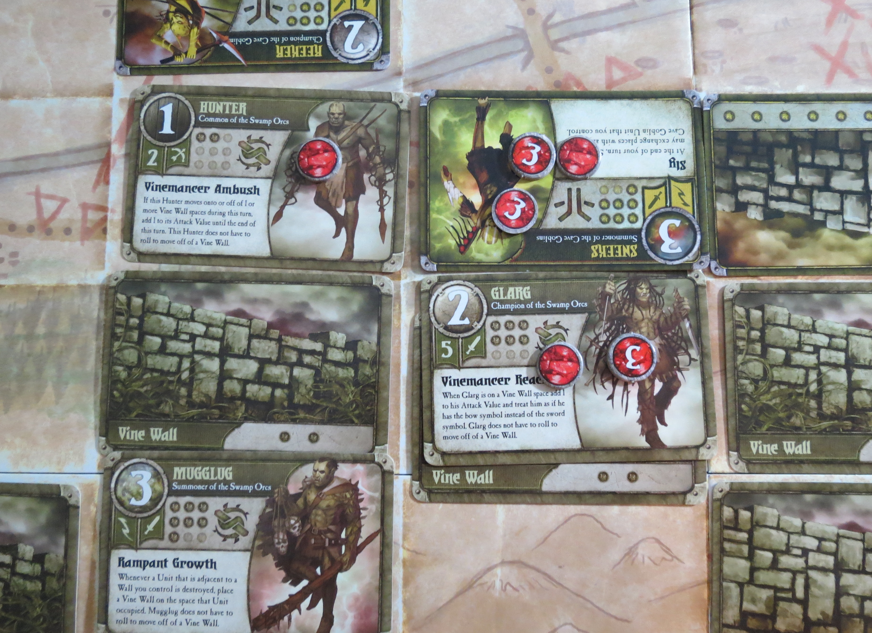 My initial goals are clear enough in concept, if somewhat tricky to properly execute. As a Swamp Orc, I need my Vine Walls to grow out to every corner of the board (though preferably towards the Cave Goblins’ corners) in order to provide spots to activate most of my units’ best abilities. Put simply: with Vine Walls, I am a bit more powerful than your average faction; without them, my troops will be severely outnumbered, overpriced, and many sans abilities. I’d also like to create a long horizontal line of these Vine Walls across the board (correction: horizontal to me. To a viewer, my goal would be a long north-to-south blockade) to block access to the swarming goblins and their love of attacking from multiple sides.
