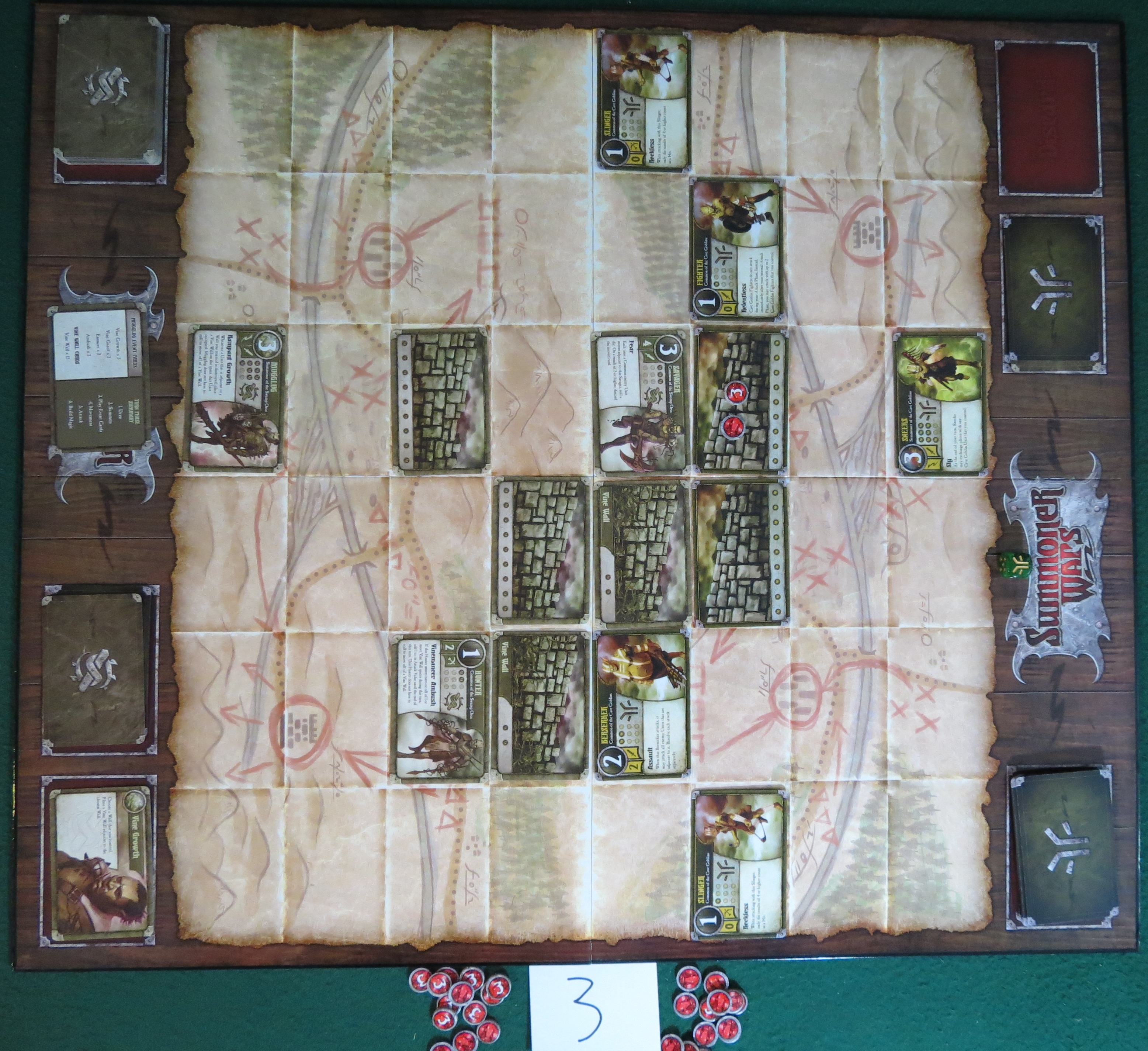 Two can play at this game of wall-building! I put down my second Wall across from hers so that only a single space fills the gap, then play Vine Growth, which lets me place a Vine Wall next to a Wall I control. I choose the one I just built, and place the brand new foliage in front of it, thus blocking the forward summoning spot she just made for herself. Then my Shaman scoots around the southern edge of the new Wall with my Hunter hot on his heels. The Shaman tries to blast the Berserker from a distance and misses, so my Savager makes up for it by putting another wound on Somerset’s starting Wall.