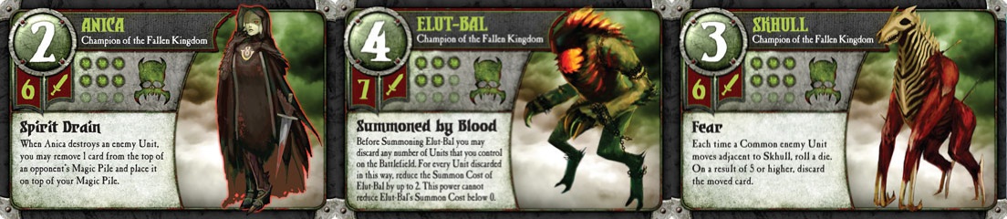 Because of the Deep Dwarves’ need to use magic to activate their best abilities, Anica joins my army to loot their stockpiles with her Spirit Drain. Elut-Bal is always a menace with 4 melee attacks and has the added bonus of often costing next to nothing to summon. It isn’t uncommon to attack early and hard with this guy. And Skhull will be coming as well because his Fear ability is such a potent deterrent. Interestingly, the FK only have four champions to choose from (since we’re not putting Mercs into our decks for this series), so I believe these are the obvious choices since Dragos’s healing ability is not as meaningful as taking magic from Dan.