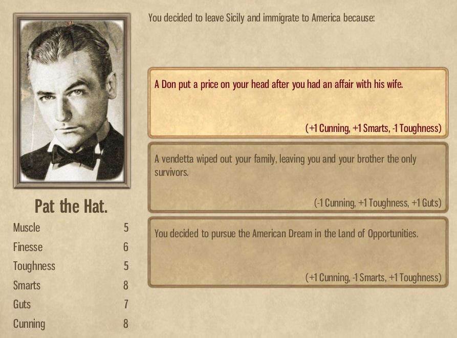 I’m an absolute sucker for anything gangster (and when I say that word, I mean prohibition-era organized crime, not “gangsta“), so despite middling reviews, I had little choice but to pick up Omerta: City of Gangsters. Because it had “Gangsters” in the title, you see. Anyway, that handsome devil up there is Pat the Hat. He has a period after his name because that’s how seriously he takes himself. He wasn’t always so austere — his childhood nickname was “Earful,” he had some trouble with loan-sharks as a young man, and he had an affair with a local Don’s wife and had to flee to America. As you might be able to tell, his youthful choices have made him slippery and brash, but not very imposing.