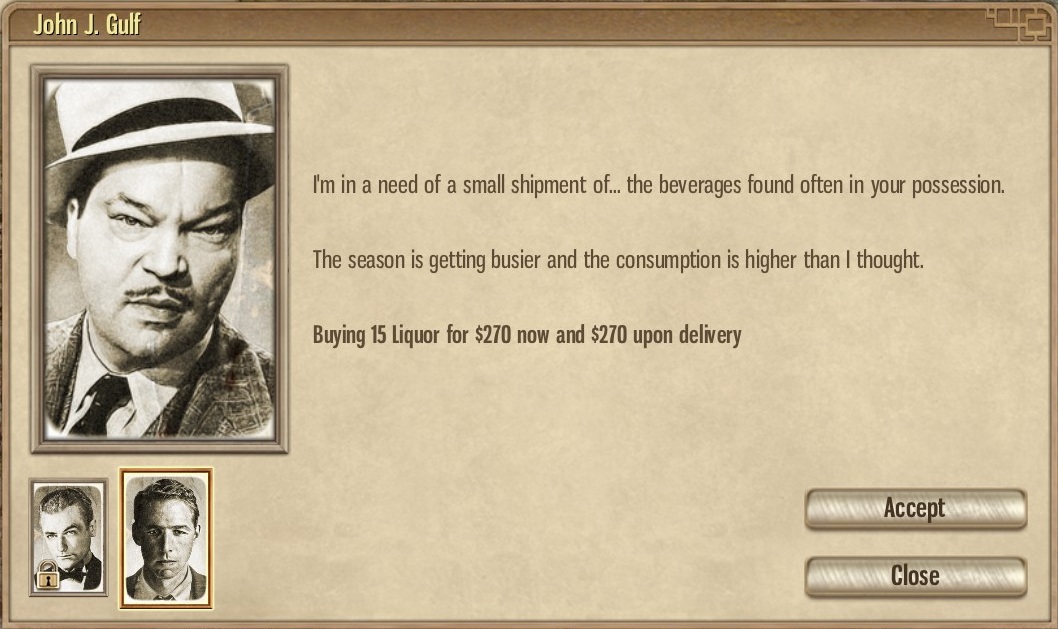 Turns out Squigs is also a member of my gang, though he’s fine lazing around without pay when I don’t need his services. He’s so easy to please that he’s also perfectly happy knocking over an enemy brewery solo. He just runs out the hideout’s front door, makes a right-hand turn at the corner, and knocks on the brewery door. Moments later, I’m informed that I have 30 cases of beer ready to sell. Geez Squigs, you’re stacked. Here, have your fifteen dollars.