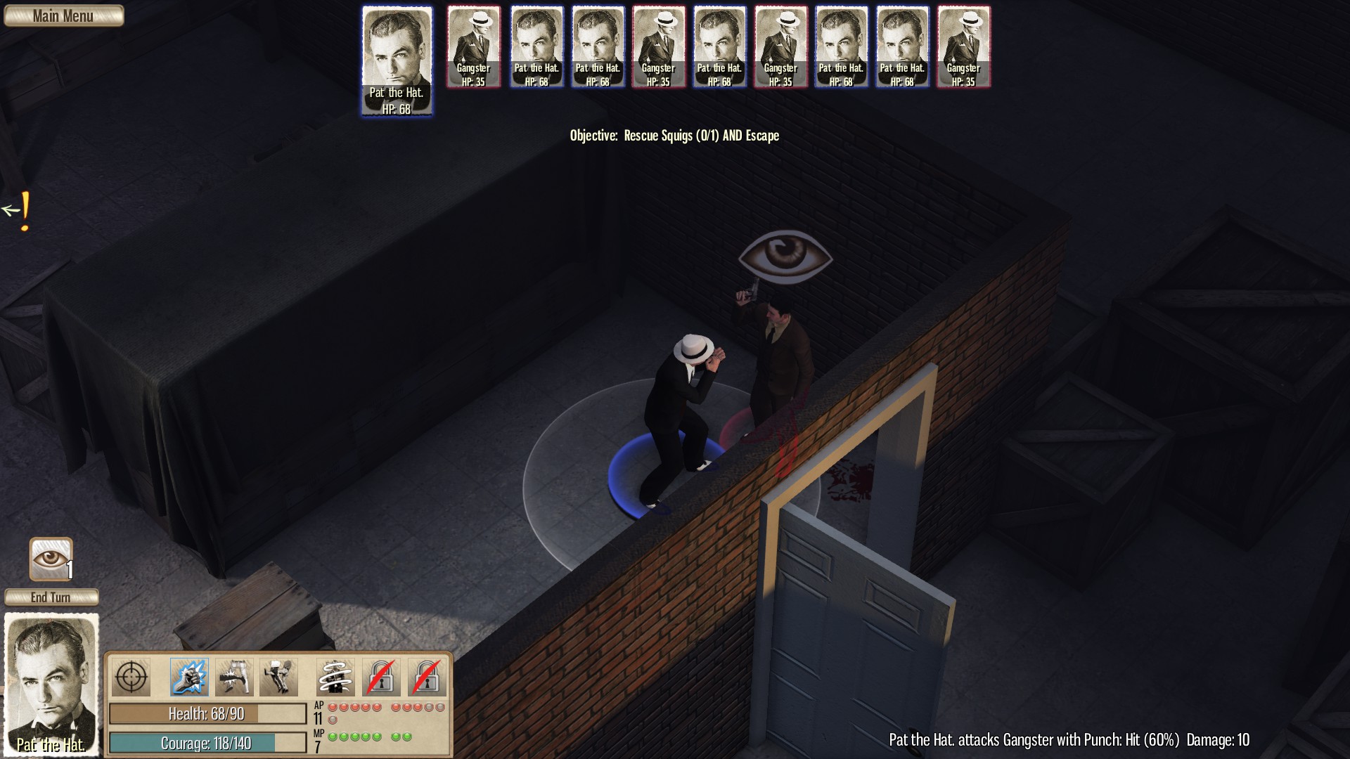 After Squigs kills one of the enemies, Pat the Hat gets bored and runs out from cover to punch someone. He gets gunned down en route to the nearest baddy. That’s fine, he needed a break anyway.