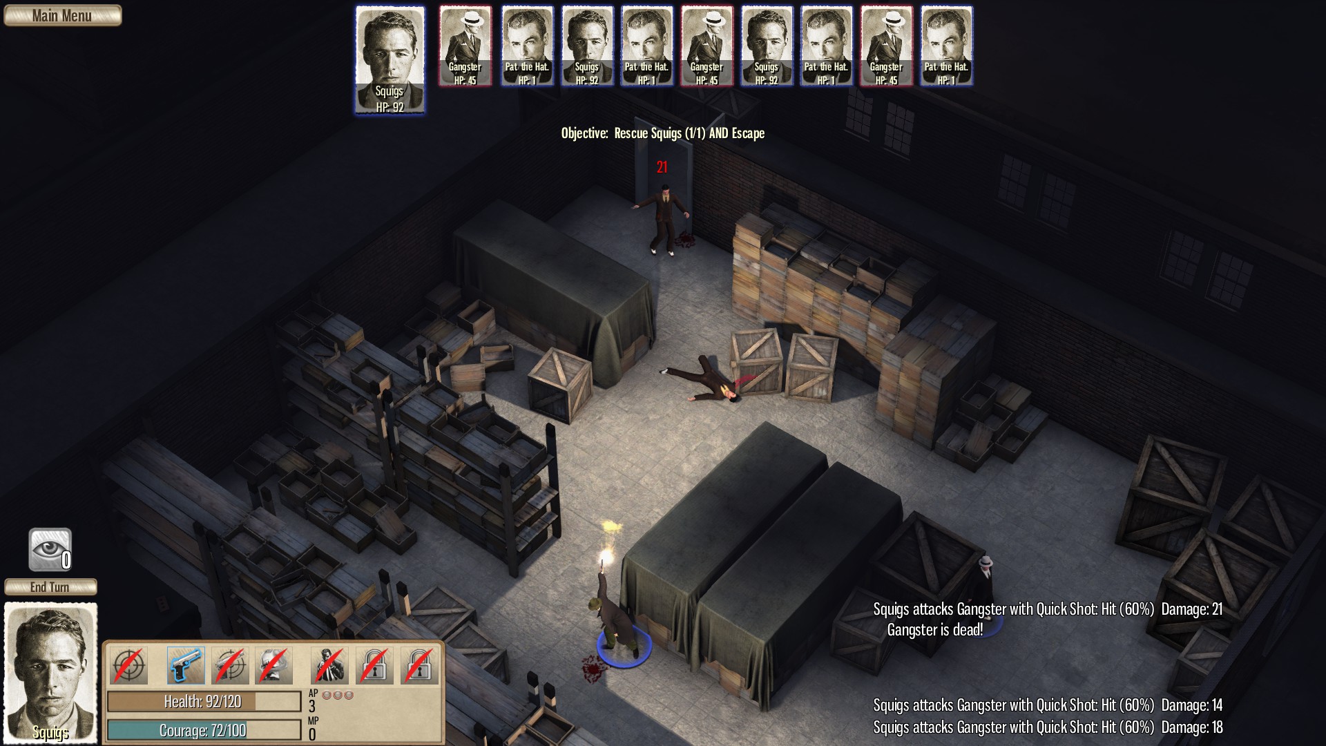 When Pat was trying to punch that first guard to death, I figured out that I could also sweep his leg or kick him in the balls. Neither one seemed to do anything particularly impressive — a little bit of condition damage here, a couple fewer action points there — and it turns out that things are pretty much the same with Squigs’ pistol. He can spend more action points to aim, and he can “gut shot” enemies to give them bleeding damage, but none of the extra options trump firing off an extra few bullets instead of wasting the action points on fancier techniques. Furthermore, there’s no concern about ammunition. Not only do I have limitless amounts of bullets, so there’s no reason to move Squigs forward when he can trade rounds indefinitely from the comfortable security of the crate he’s hiding behind, but there’s never even a need to reload, thus removing any tactical nuance to the number of shots I’m firing. If I had to reload every few rounds, and doing so consumed action points, I might conceivably see the value in better-aimed or more powerful shots. Instead, spraying lead everywhere proves the superior strategy.