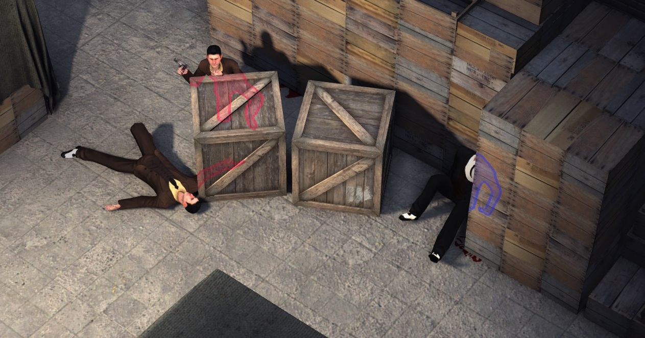 Only once I arrive does the game inform me that I don’t have a gun. Or a baseball bat or tire iron, or anything really. It still teaches me that I can take cover at special green-marked locations, though none of those places are spots I’d actually like to take cover, like next to a doorway or behind some crates between me and a guard who’s holding his pistol up in the air. I do my best to hide, though this means Pat the Hat has his back pressed up against some crates while the guard looks him right in the face. Then the guard runs right past me and starts shooting me from the other side.