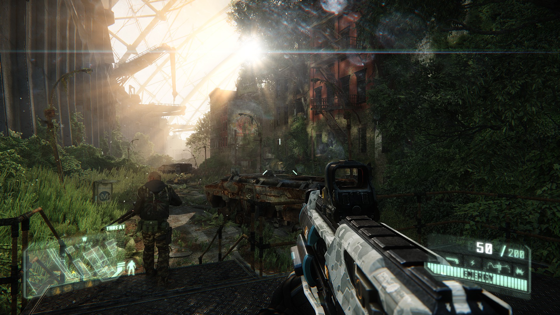 Crysis 3 picks up a couple decades after the Ceph aliens have been defeated in Manhatten, and thus defeated across the entire globe (because everything revolves around the Big Apple, always). In the meantime, Prophet and his magic nanosuit have been searching tirelessly to figure out a way to defeat the Alpha Ceph, the alien boss who Prophet must mention every time he opens his mouth. At some point, the evil CELL Corporation, who you may recall as the human enemies from Crysis 2 that you shot at when you weren’t shooting at the Ceph, captured Prophet and froze him or something. They erected a big nanodome over Manhattan, and now are the de facto rulers of the earth because they own all the world’s energy through mysterious means — very likely captured, unethical, and dangerous alien technology that will lead to the re-awakening of mankind’s most dangerous enemy.