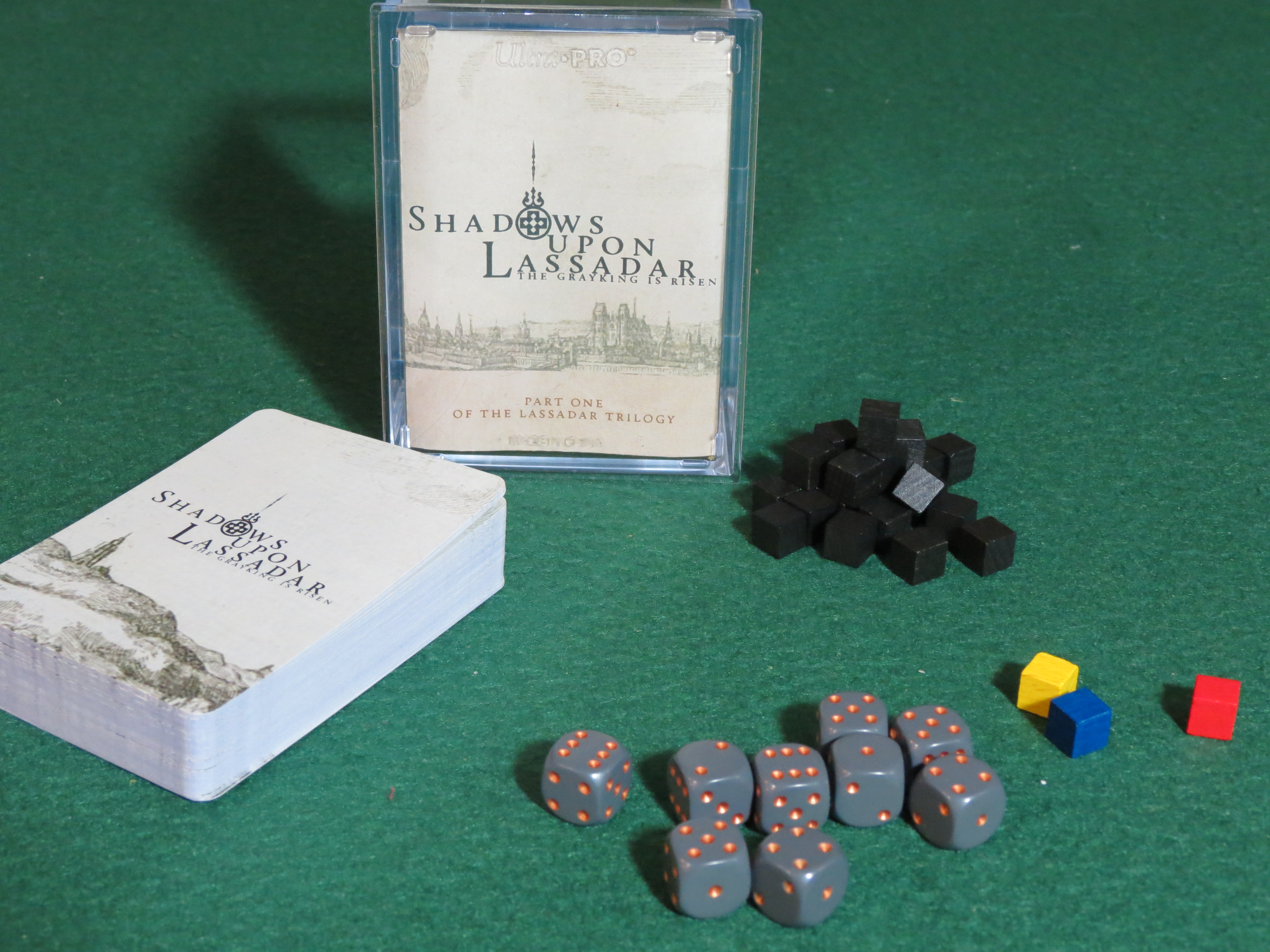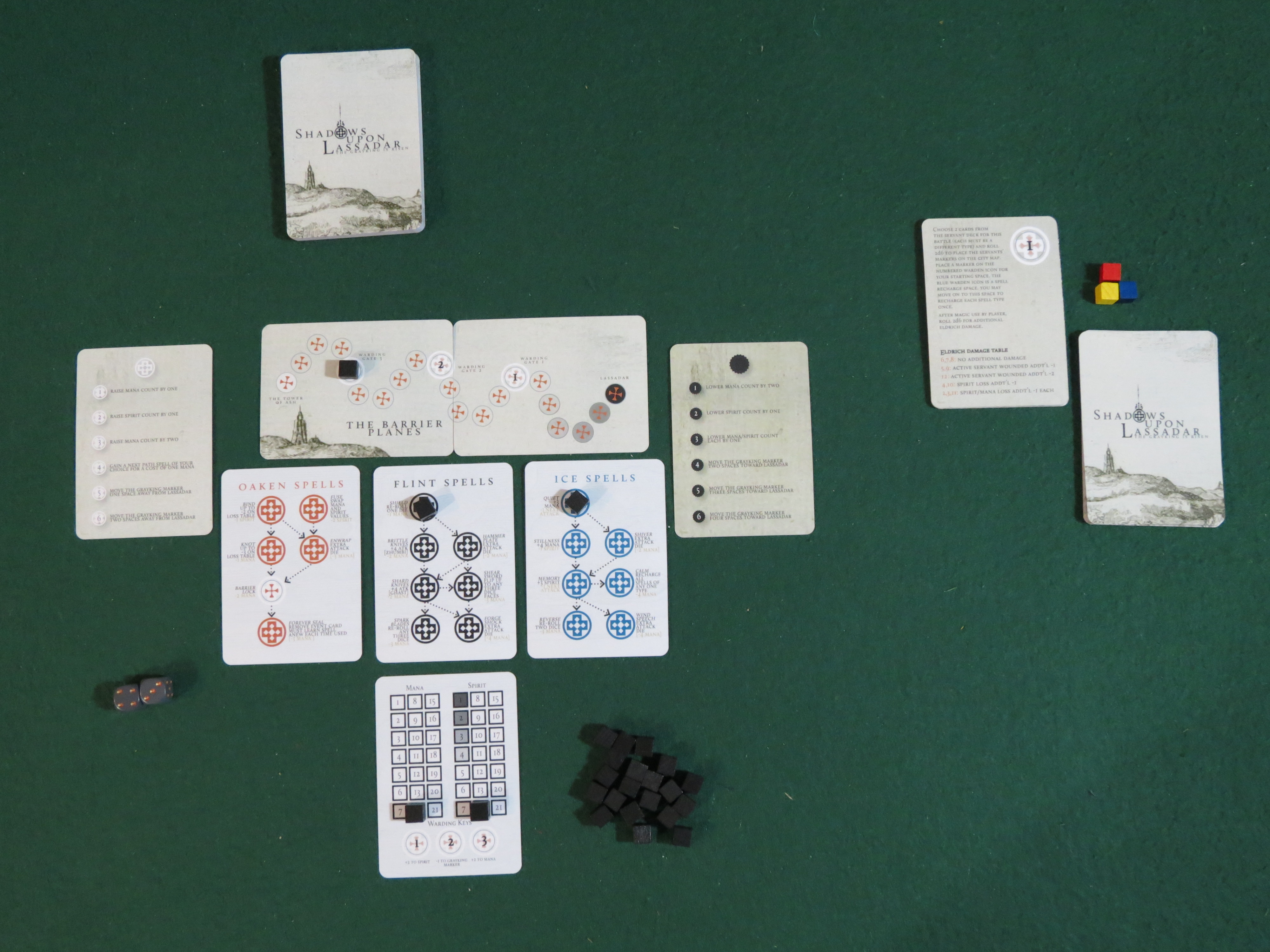 Like your quest, Shadows Upon Lassadar looks a bit convoluted when you first set it up. You have a tracker for your life (“Spirit”) and mana, victory and defeat tables that you’ll refer to when you succeed or fail quests, spell trees to mark out which magical arts you’ve mastered, and a chart that shows exactly how close the Grayking is to entering Lassadar. You have a deck of monsters and a deck of city map cards off to your right, and a deck of quests up front; and a heap of cubes sizable enough that you’re wondering how many darn things you’re going to be keeping track of.
