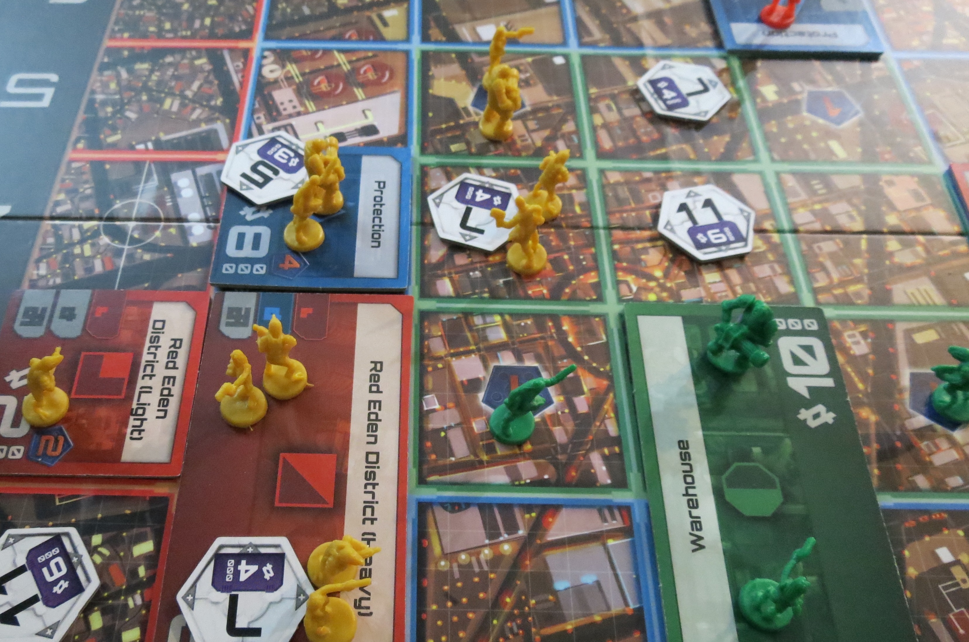 I played as one of the weaker battle teams and was deathly afraid of losing an early battle and getting railroaded off the board. When you lose a battle you lose a gang member and a card from your deck. So I slowly built some buildings and always kept the best fighting cards in my hand. The aggressive team did their thing but could only threaten a couple teams so the one that got to build unhindered got the most ARCs and easily won the game.