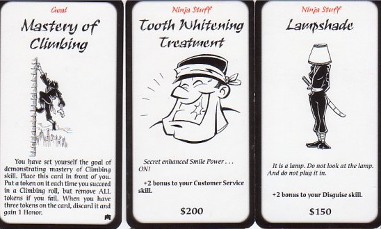 You play as a ninja with a smattering of stats and abilities. More than any mere ninja, you’re an employee of Ninja Burger, which guarantees delivery of their burgers in 30 minutes or less; otherwise, the tardy ninja commits seppuku. Not right away, of course, it takes a few failures before your honor drops to the point of being permitted ritual suicide. On the other side of the coin-with-a-square-hole-in-it, if you bring much honor to your franchise, you’ll be promoted to manager. In order to climb the corporate ladder, you draw Fortune cards that can give you special ninja items like lampshades to put on your head as a disguise, ninja tricks to hinder your coworkers as they try to be better employees, and various ninja styles to master for extra honor. You then draw Mission cards that are usually deliveries to dangerous locations like a mad scientist’s lab or botanical gardens filled with killer plants, but can also be menial errands like walking the restaurant’s mascot leopard. You choose whether to go to the staff meeting to trade tasks (or shunt errands off onto less-honored ninja) or to ditch the meeting to get an early start on delivering your order, the success of which is determined by lots and lots of dice-rolling.