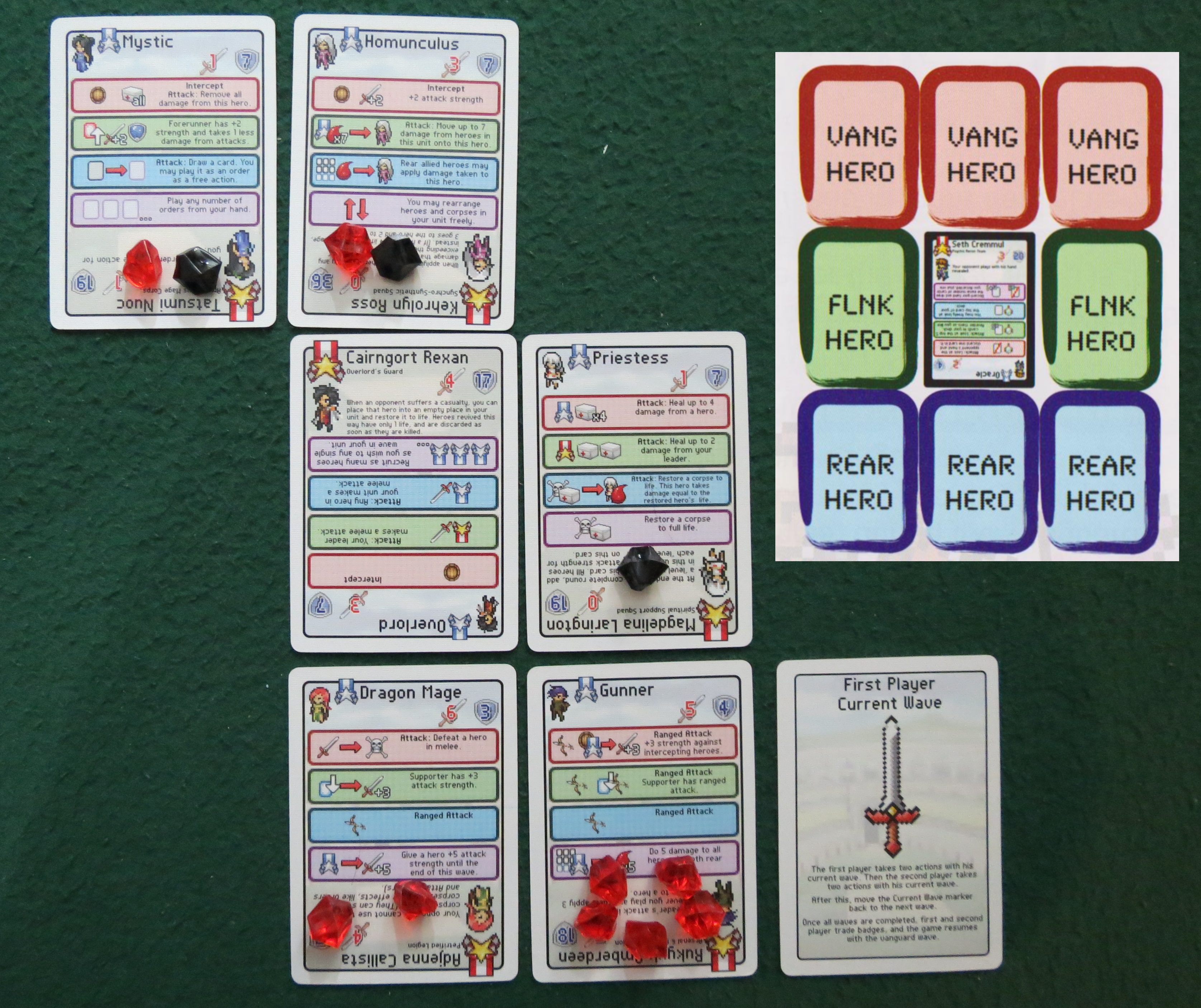 If all those abilities seem a little intimidating, have no fear, because you don’t actually need to worry about all of them all the time. Play progresses one wave at a time, so in one round both players will take two actions during their Vanguard Wave, then their Flank Wave, then the Rear Wave; then you switch first and second player markers and do it all over again. Furthermore, you can only attack with heroes who were in that wave at the start of it; you can only recruit new heroes into the current wave as well. This means the chances of getting bogged down aren’t as pronounced as they would be otherwise.
